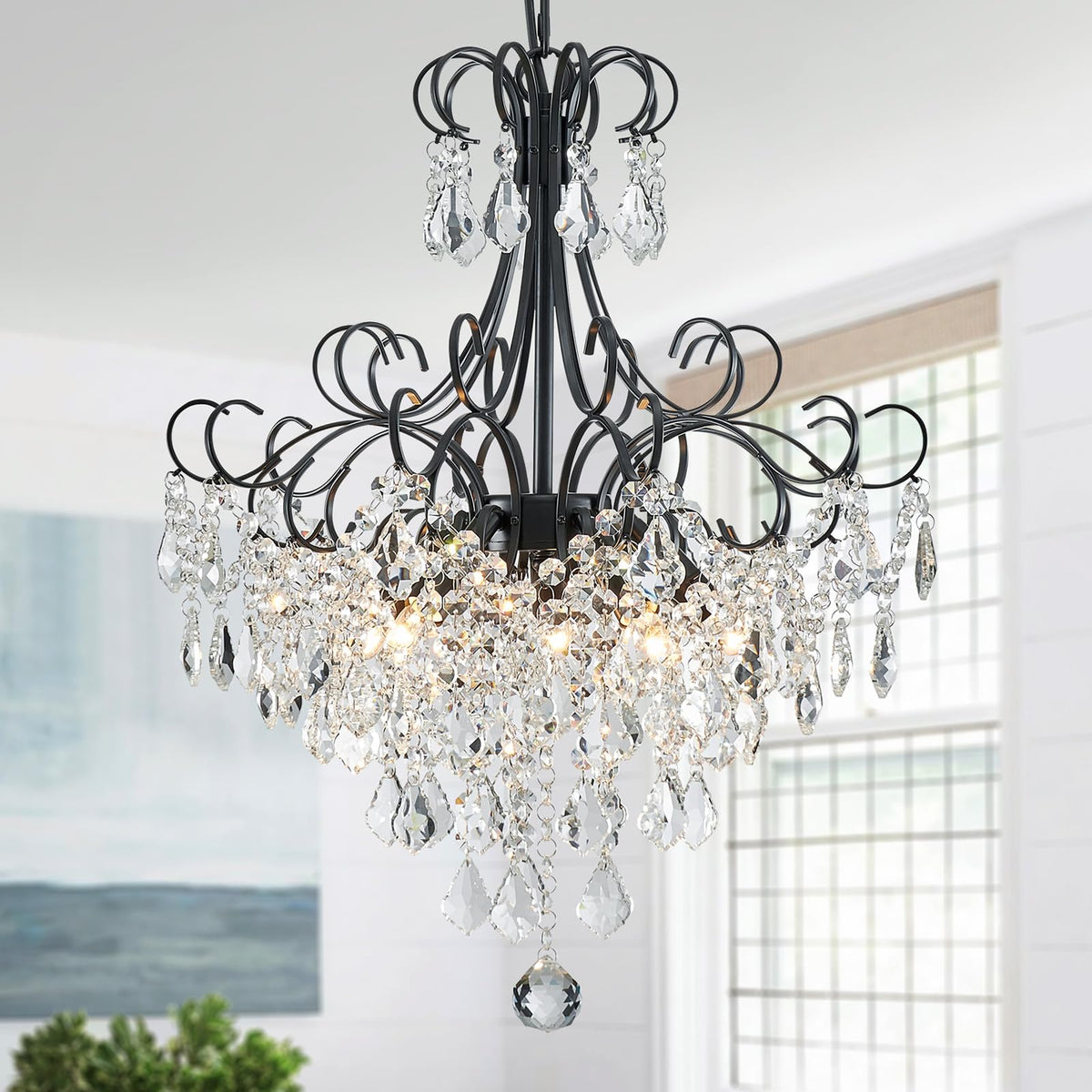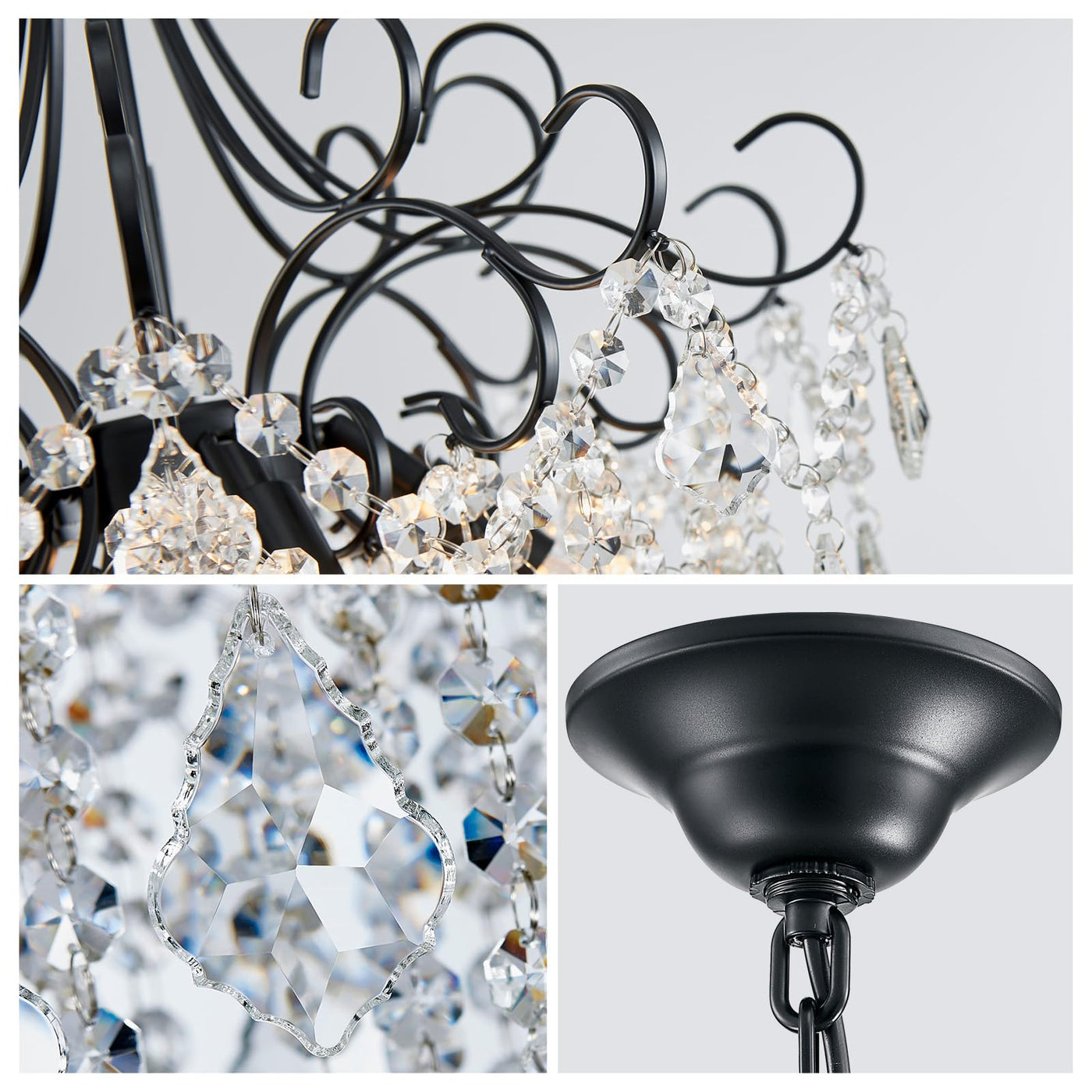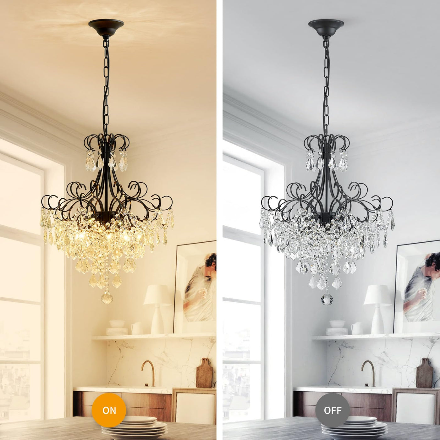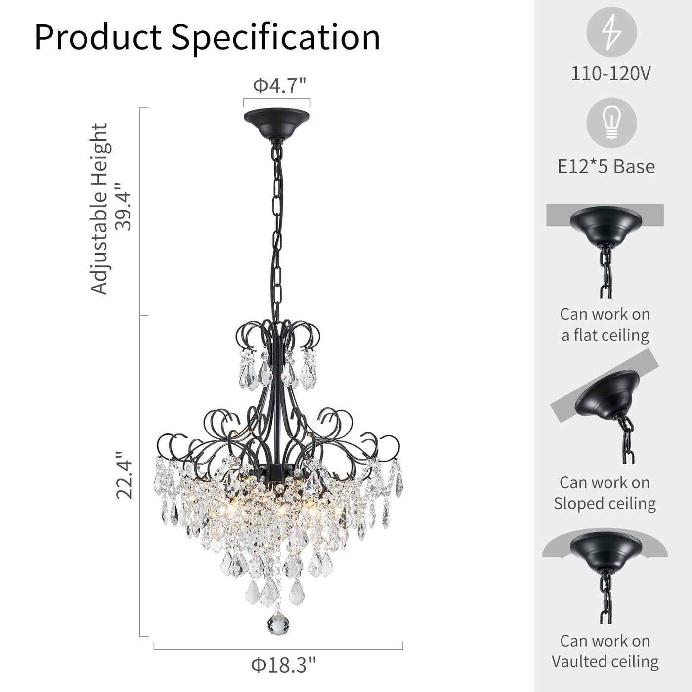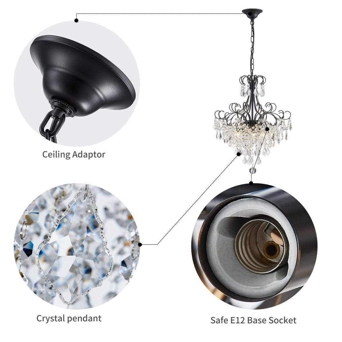 Chandelier Size: 22.4 inches high and 18.3 inches wide. Canopy: 4.7 inches wide. Bulb Base: E12, 120V 40watts(Max). (*Bulbs Not Included* You need to get 5*E12 Led Bulbs depending on the lighting effects you want). Compact Design: Sparkling glass crystals which has a glass touch and feeling make it uneasy to break and could create a superior and classy atmosphere in your room. Easy Installation: Assembly required(include hanging the crystal strings to the black plate) and easy to install, with all mounting hardware and a detailed mounting instruction included. Widely Use: Hallway, Living Room, Dining Room, Porch, Hotel, Staircase, Island, Foyer, Bedroom, Office and etc.