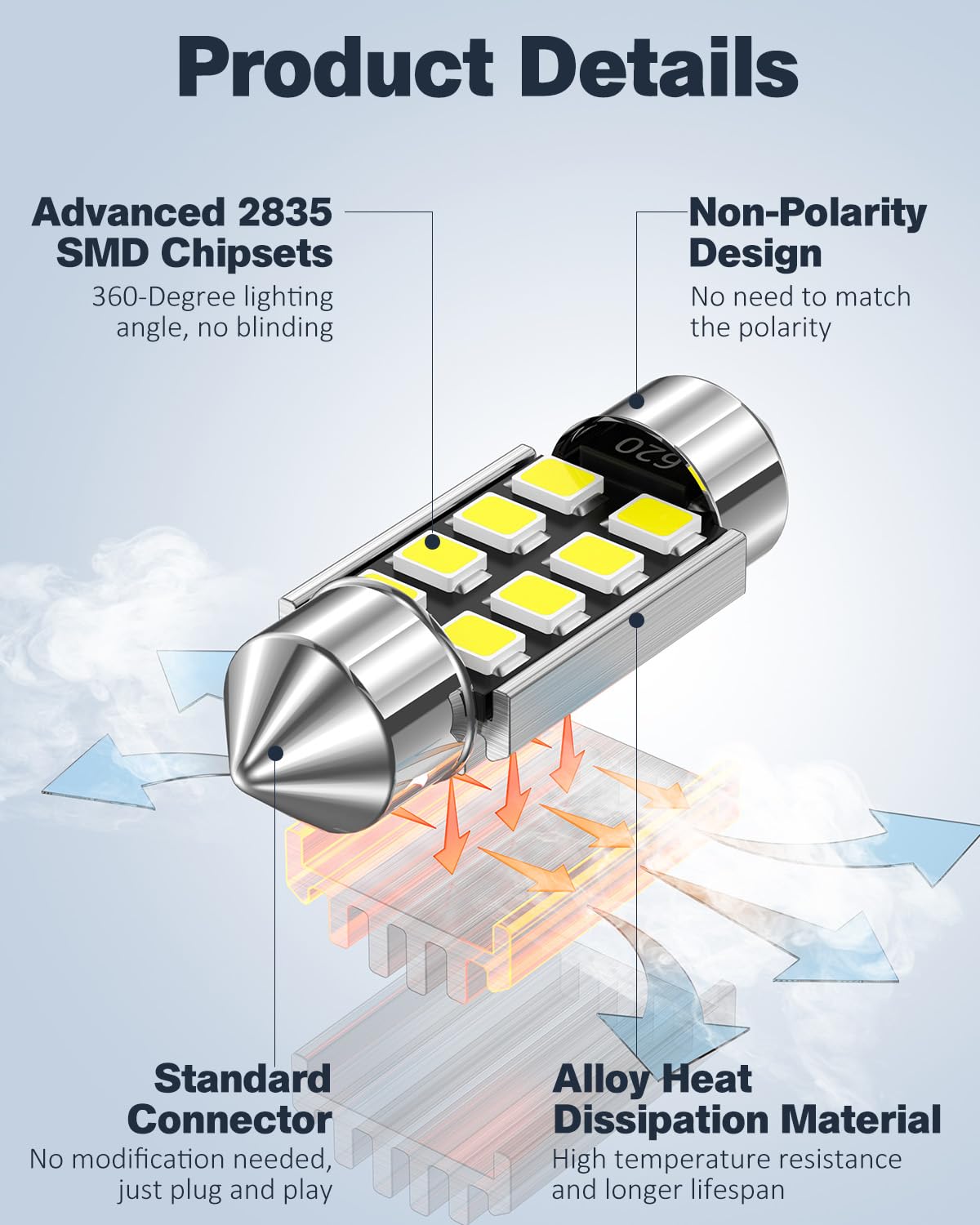 Q: What applications can these LED lights be used for in my vehicle?A: The Xdoar LED Interior Car Lights Kit can be used for various applications, including reading lights, door lights, ceiling lights, dashboard lights, trunk lights, glove box lights, indicator lights, and license plate lights.