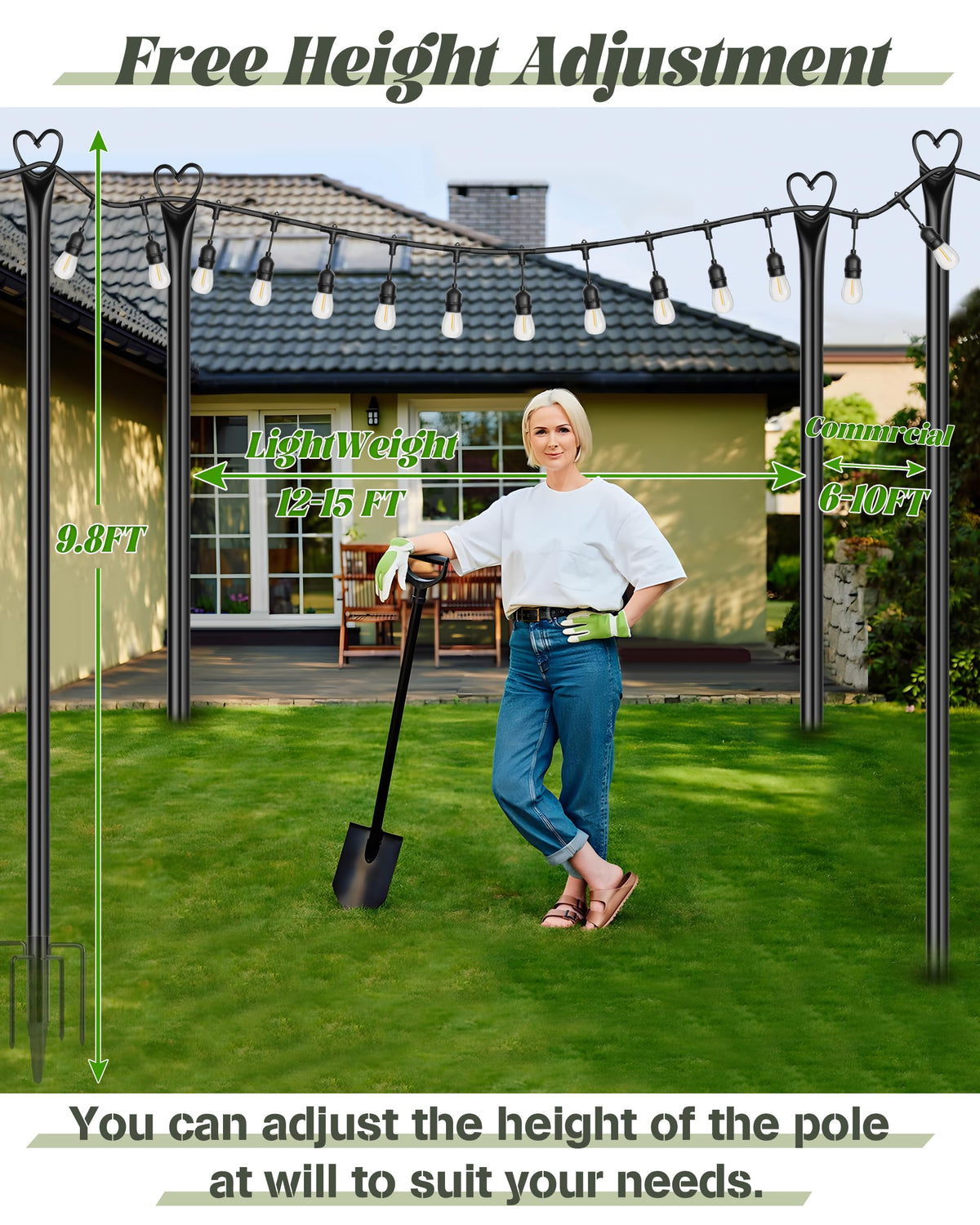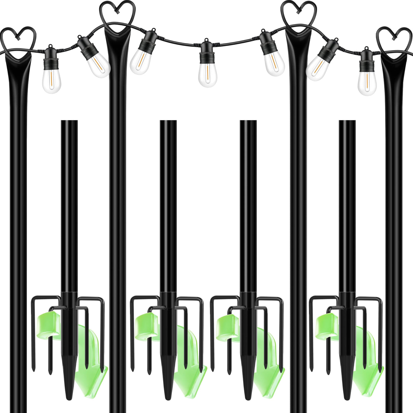 Q: Can these poles be used for different types of outdoor decorations?A: Yes, the versatile design allows you to safely hang various outdoor decorations such as string lights, lanterns, balloons, flags, and garlands, making them ideal for gardens, patios, and events.