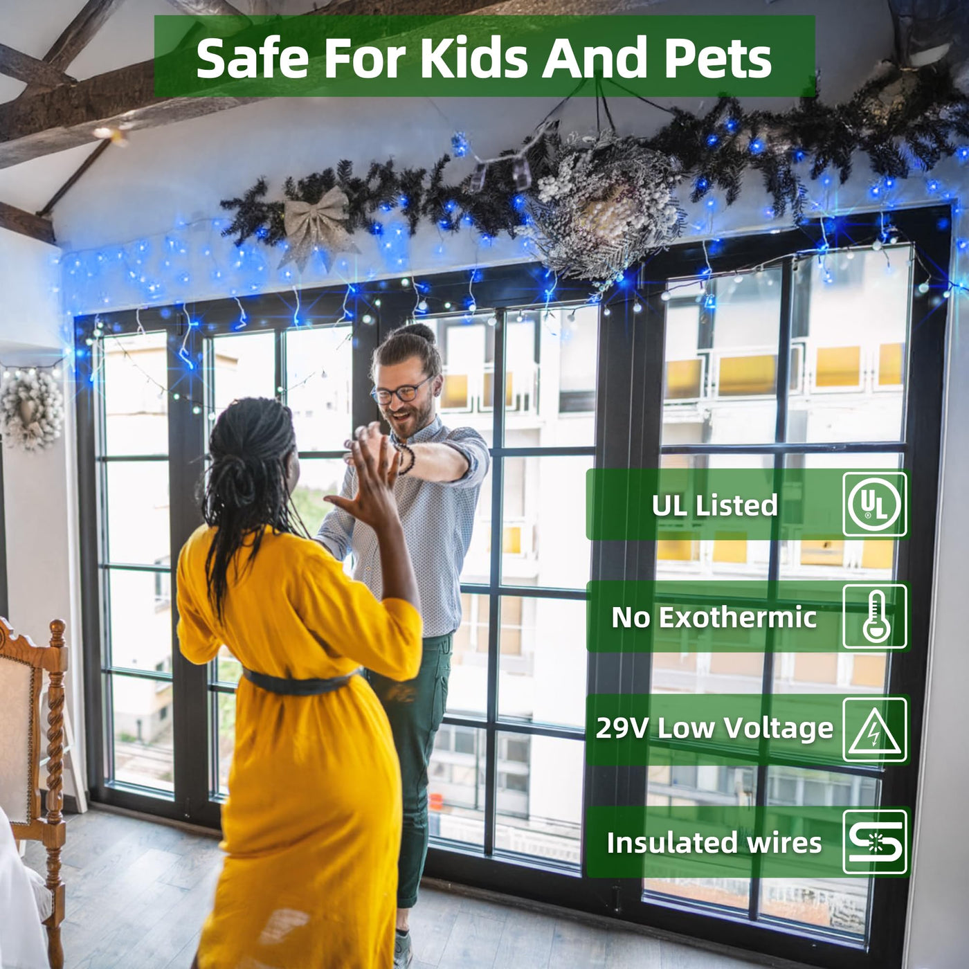 Q: What safety features do these Christmas lights have?A: The lights are designed with safety in mind, operating at a low voltage to remain cool to the touch and have been UL tested to meet the highest safety standards.