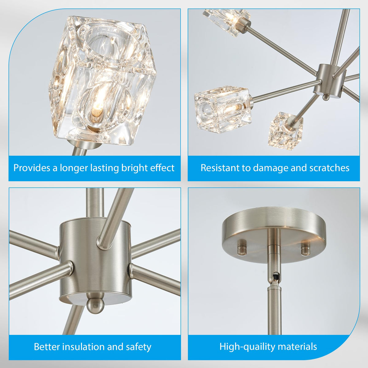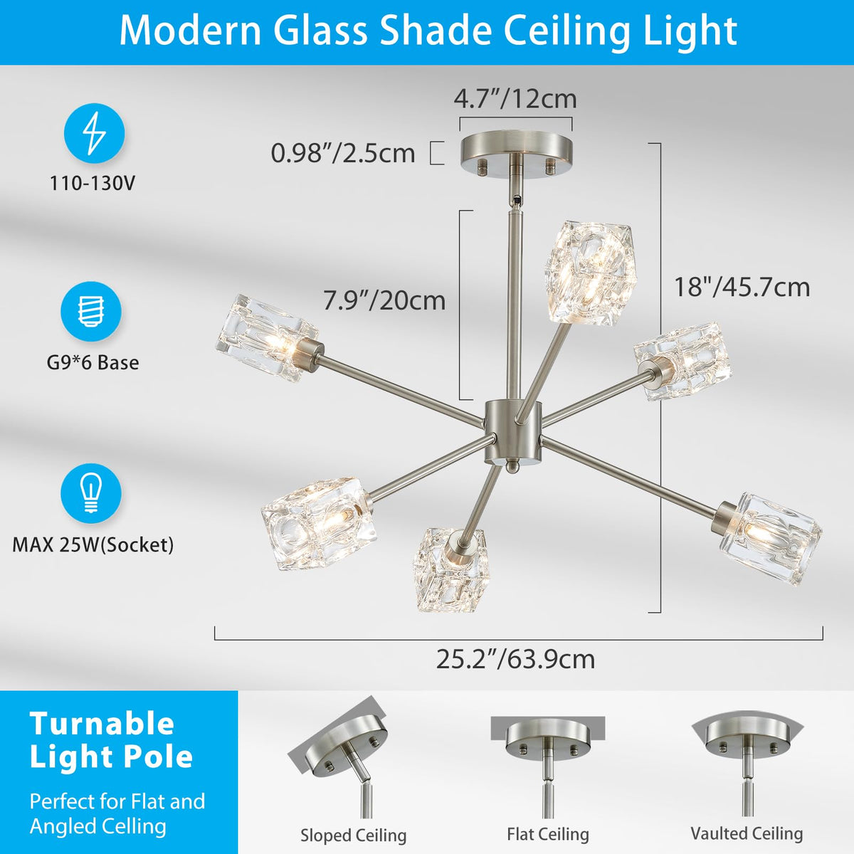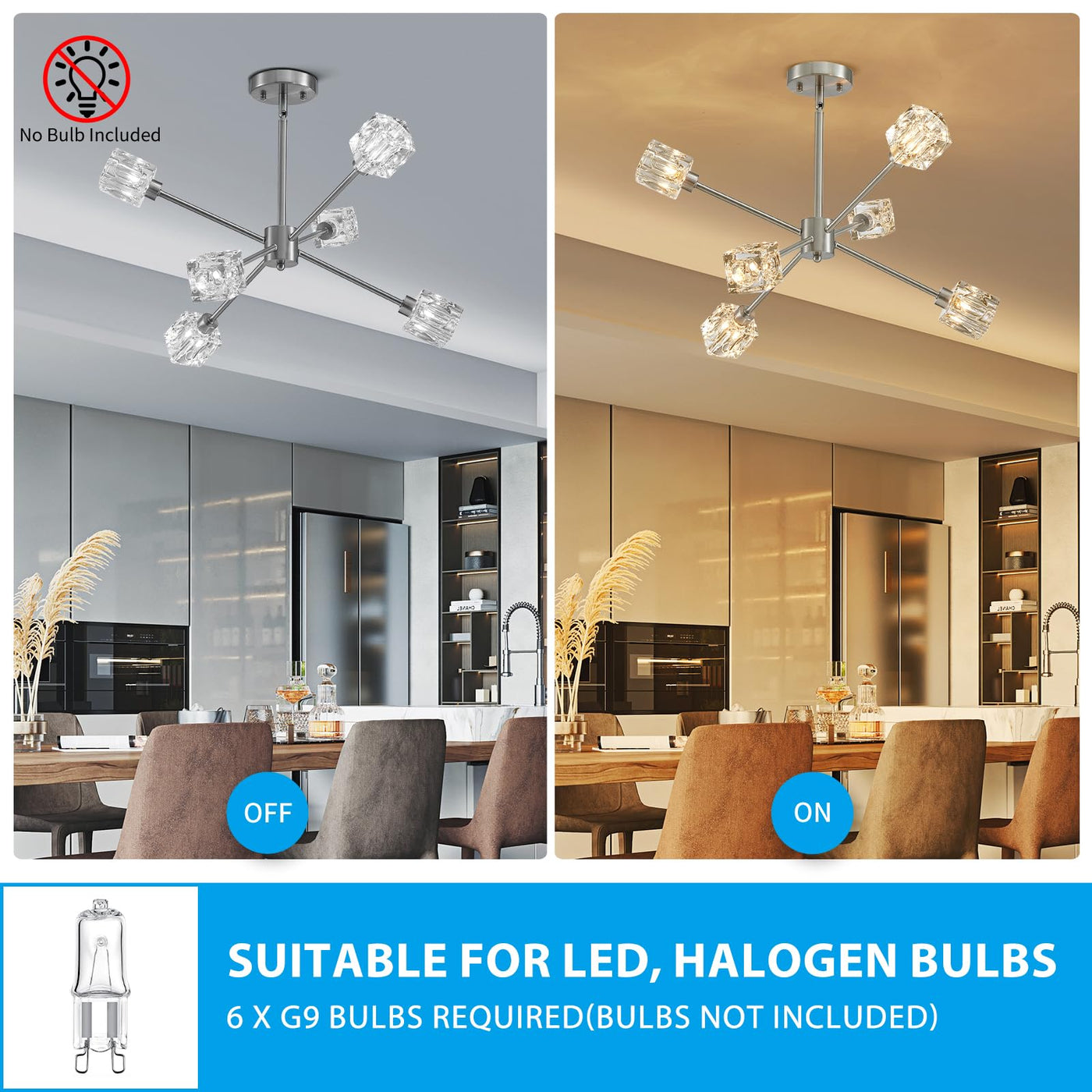 Introducing the 6-Light Sputnik Ceiling Lights: Elevate your space with this exquisite fixture featuring six high-quality transparent glass lampshades and a premium metal body, ensuring durability and long-lasting performance. Suitable for G9 base bulbs, including LED and halogen, it supports dimmable bulbs and dimmer switches (not included) for customizable ambiance. Measuring 25.2''x25.2''x18'', it's perfect for living rooms, kitchens, hallways, bedrooms, staircases, foyers, bars, or entryways. Installation is effortless with included hardware and instructions, fitting sloped, vaulted, and flat ceilings seamlessly. Enjoy brilliant illumination and versatile design.