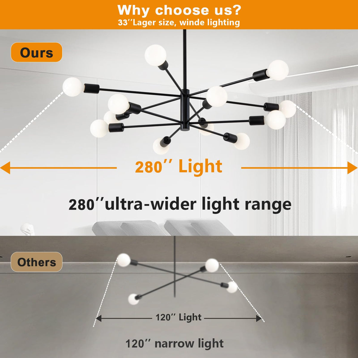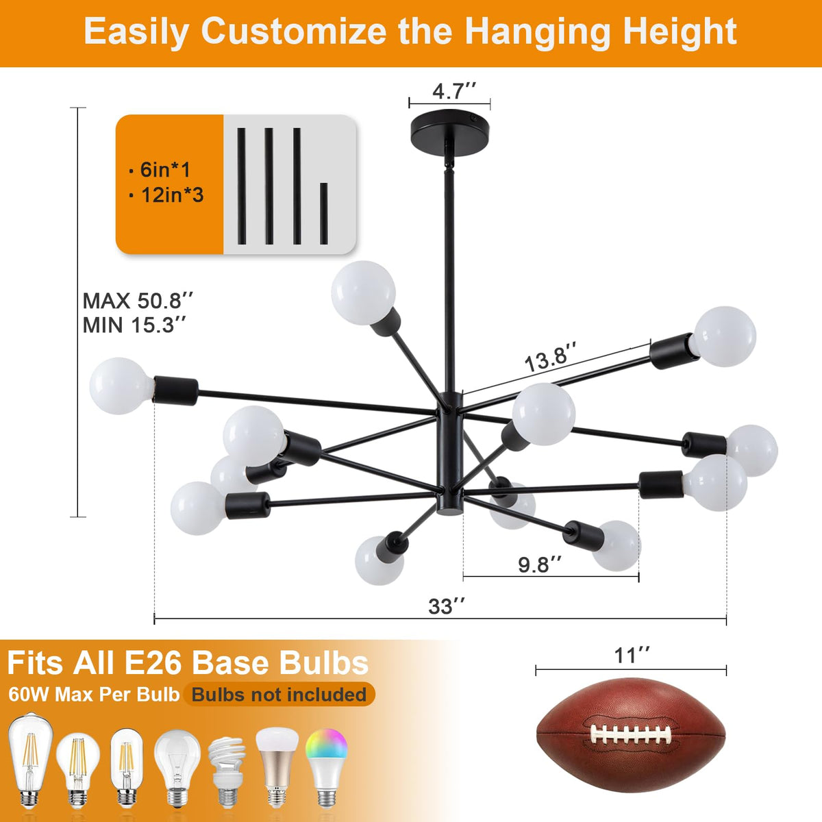 Xingsiyuelyx 33 Inch Black Sputnik Ceiling Light Fixture - 12-Light Black Sputnik Chandeliers, Mid Century Chandelier Modern Cha