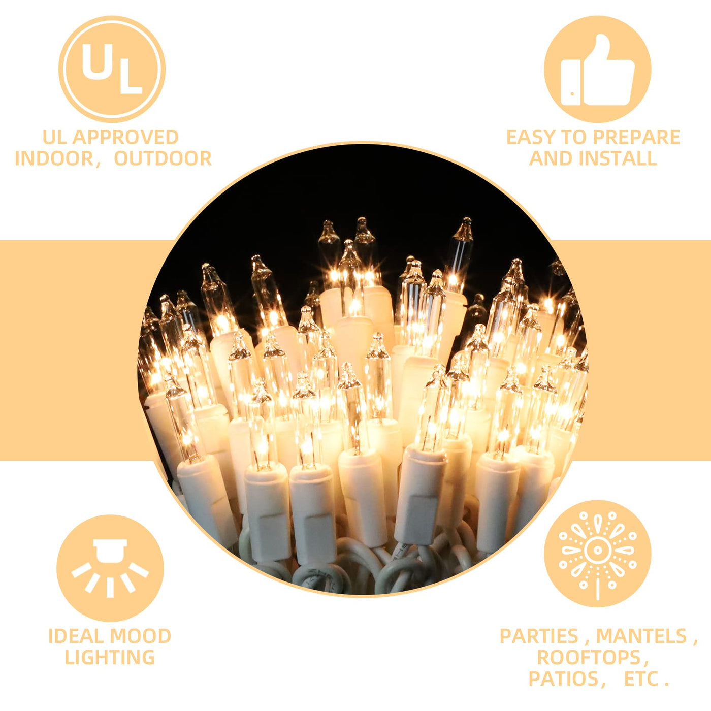 Q: How long is the XMASHOME string light set, and how far apart are the bulbs?A: The XMASHOME string lights extend to a total length of 63.8 feet, with 300 mini yellow bulbs spaced 2.5 inches apart. This spacing creates a beautiful and enchanting lighting effect for your decorations.