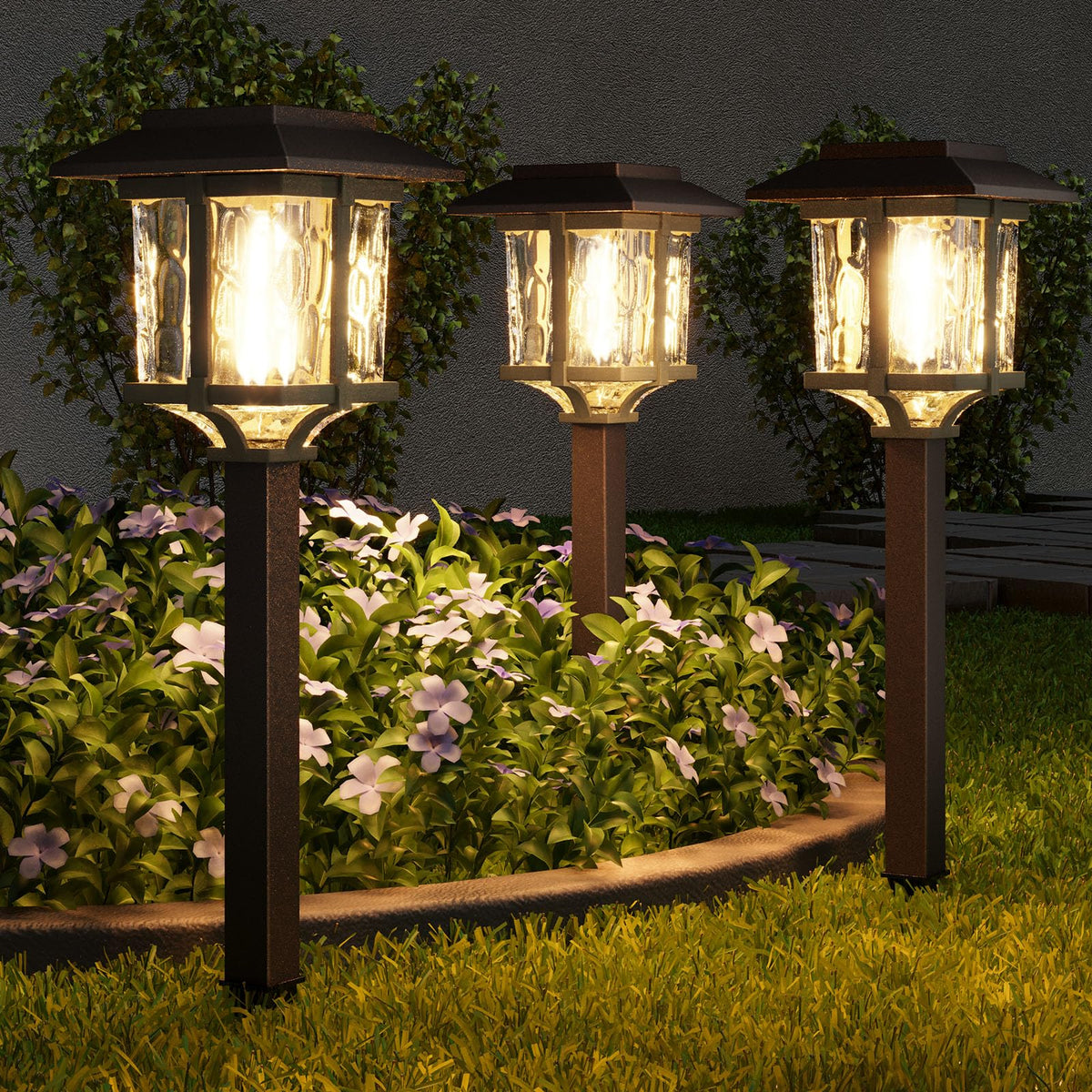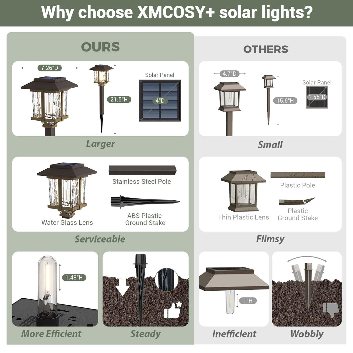 Xmcosy+ 6 Pack Garden Pathway Lights Meets Your Anticipation! With A Special Bubble Glass Lampshade, 20 Lm 2-Tone Bronze And Wood Color, Water Glass Lens, Integrated Led With Vintage Bulb, High-Efficiency Larger Solar Panel, Xmcosy+ Outdoor Waterproof Solar Path Lights, Perfect For Decorating Your Home'S Garden, Pathway, Patio, Lawn, Driveway, Walkway, Path, Backyard, Balcony, Or Everywhere Outdoor. When Using For The First Time, You Need To Pull Out The Safety Strip Which Is On The Bottom Of The Solar Panel Unit. The Surface Of The Solar Charging Panel Should Be Kept Clean In Order To Avoid Affecting The Charging Eficiency. The Light Was Created For Use In Dimly Areas. Lf A Bright Light Source Is Present The Light Will Beunable To Fully Develop Its Brightness. Package Includes - 6 * Xmcosy+ Water Glass Lens Lampshape - 6 * Stainless Steel Connection Tubes - 6 * Abs Reinforced Ground Spikes - 1 * User Manual ??Note A. Please Make Sure The Solar Panel Is Clean And Free Of Dirt And Debris. B. Always Keep The Solar Light Distant From Other Night Light Sources. C. When Inserting The Stake Into The Ground, It Is Best To Irrigate The Ground With Water First To Avoid Damaging The Ground And The Stake.