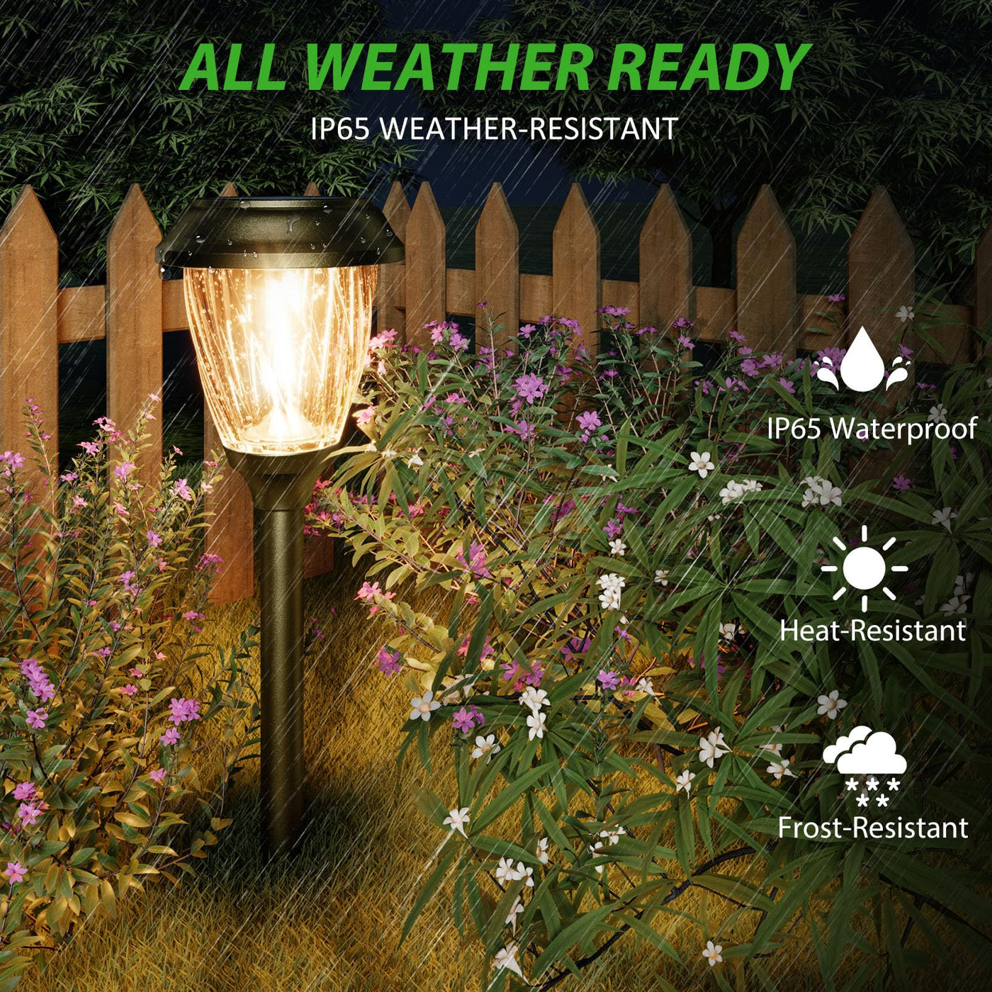 Q: Are the XMCOSY+ solar lights weather-resistant?A: Yes, the XMCOSY+ solar lights are designed with an upgraded IP65 waterproof rating, making them all-weather resistant. They can withstand various outdoor conditions, including rain, snow, and frost, ensuring reliable performance year-round.