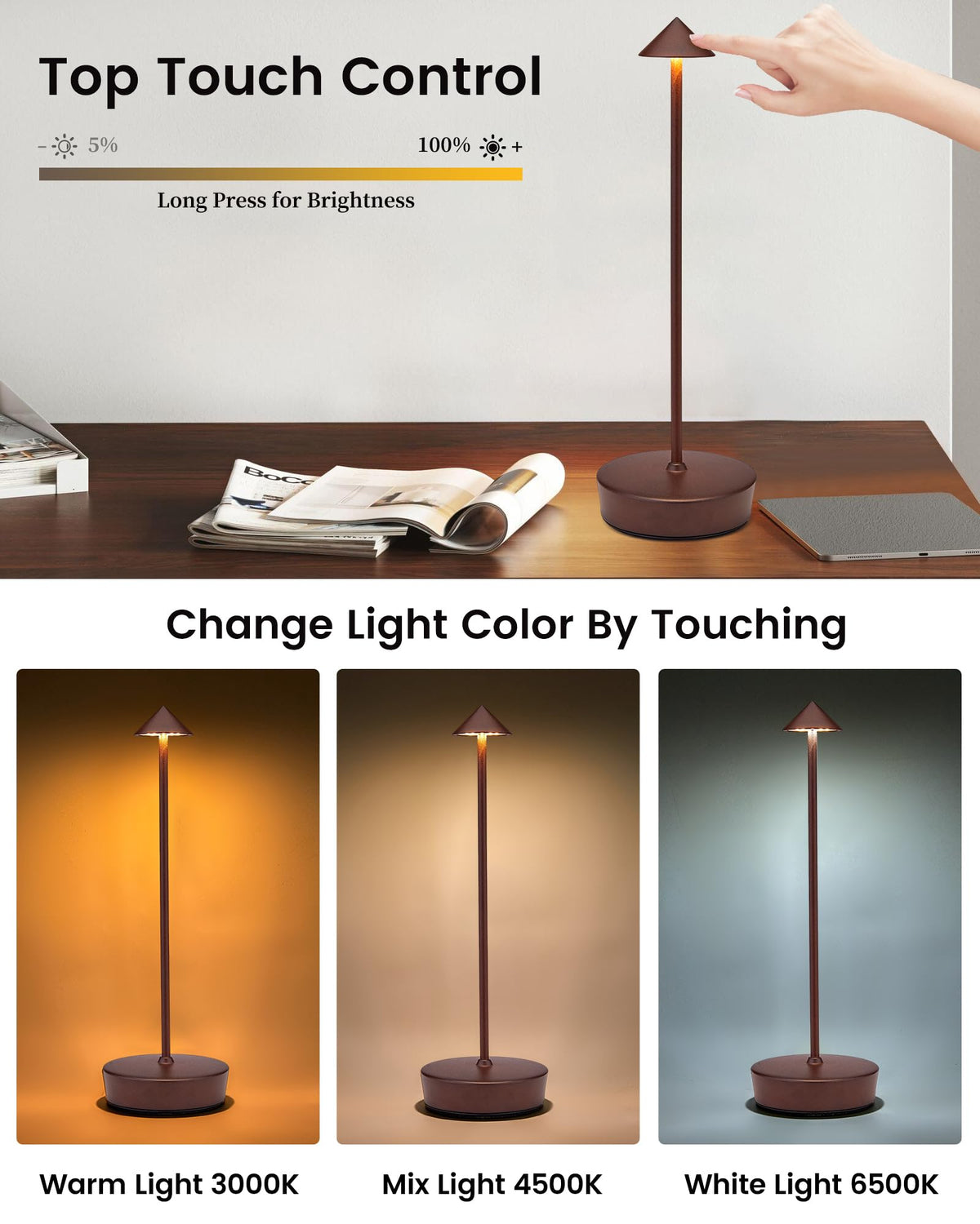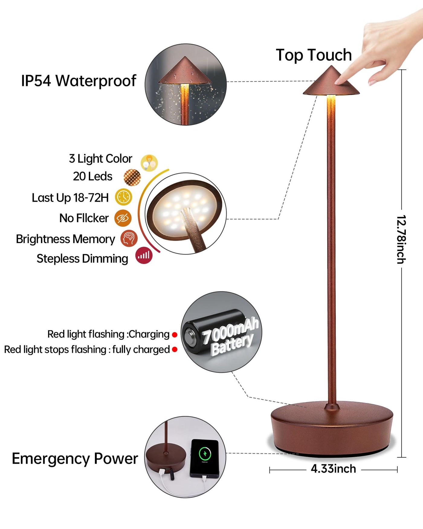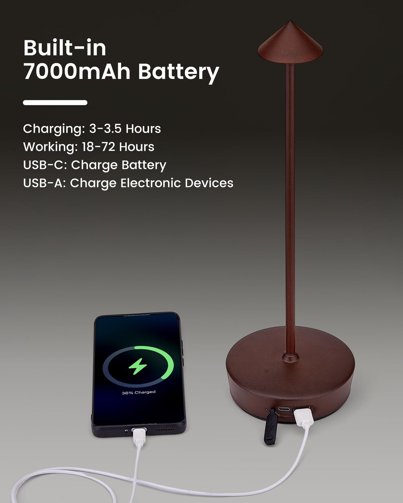 ?With Usb-A Output Port?Thanks To The 7000 Mah High-Capacity Battery, Our Cordless Desk Lamp Also Has A Usb-A Output Port, By Connecting The Usb Cable, It Is Also Able To Charge Your Cell Phone Or Pad In Case Of Emergency, The Indicator Light Is Green When The Power Output. This Feature Provides You With Great Convenience.