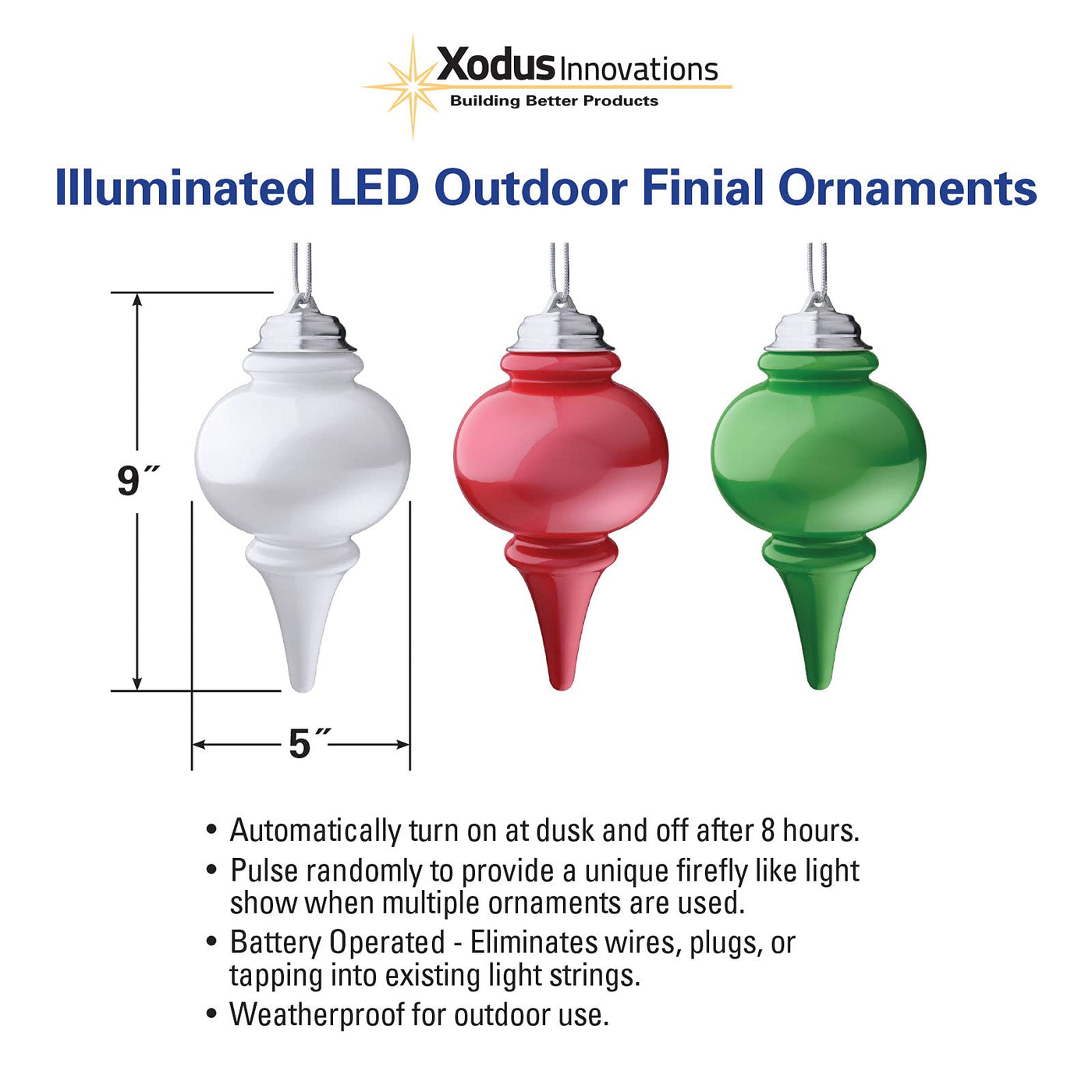 Q: What are the dimensions of each finial ornament in the pack?A: Each Xodus Innovations WP600-3 finial ornament measures 8 inches high and 5 inches wide, making them an attractive addition to your holiday decor.