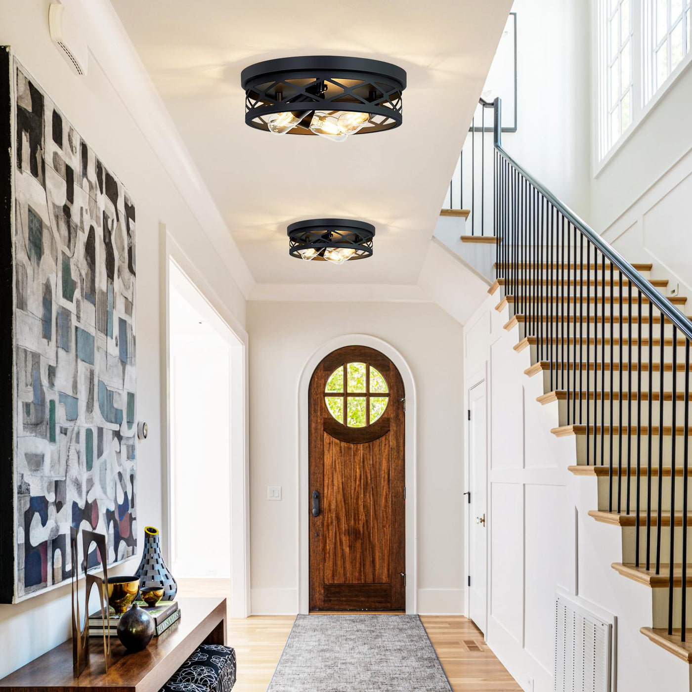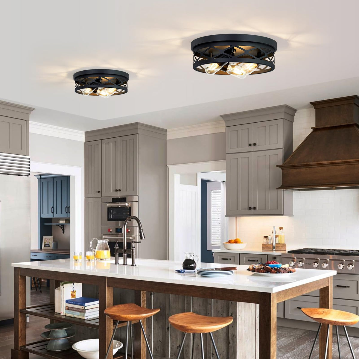 Featuring an industrial farmhouse design, this flush mount ceiling light has an open cage frame that maximizes light flow while eliminating glass cleaning concerns. It strikes a perfect balance between practicality and style, embodying the farmhouse/industrial aesthetic.