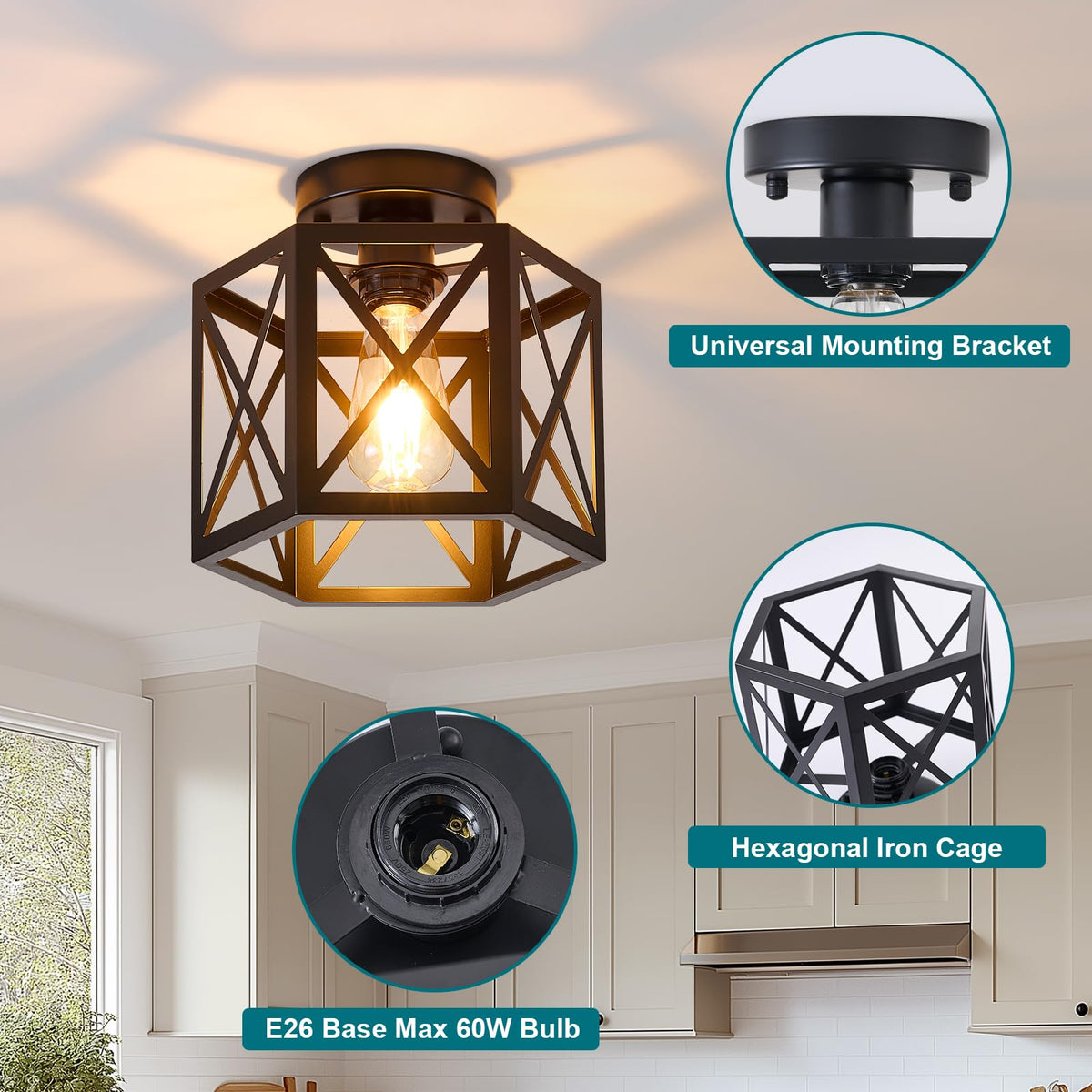 Xsdetu 2 Pack Farmhouse Semi Flush Mount Ceiling Light, Industrial Black Hallway Light Fixture, Small Metal Cage Close To Ceilin