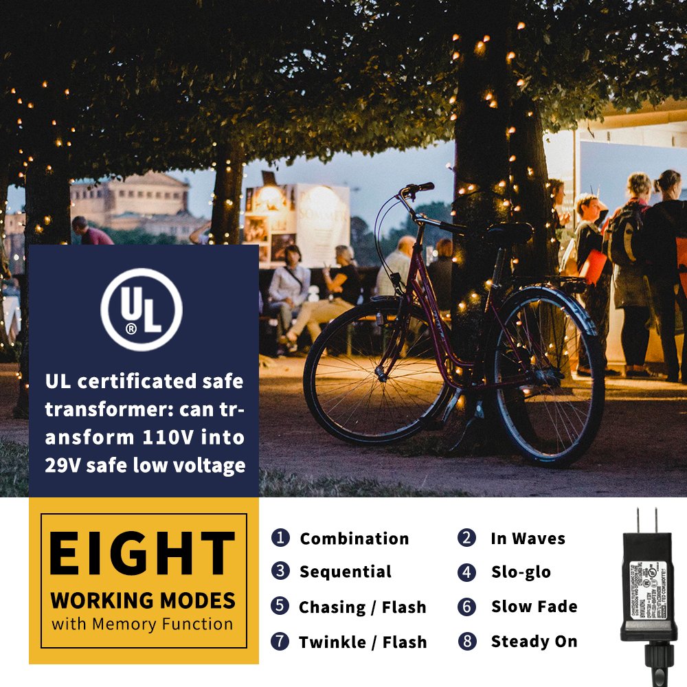 ?8 Lighting Modes With Memory Function? Our upgraded string lights with 8 different working modes: combination, in waves, sequential, slo-glo, chasing/flash, slow fade, twinkle/flash, steady on. The controller is designed to remember the last setting after cutting off the power. No need to set the light again.