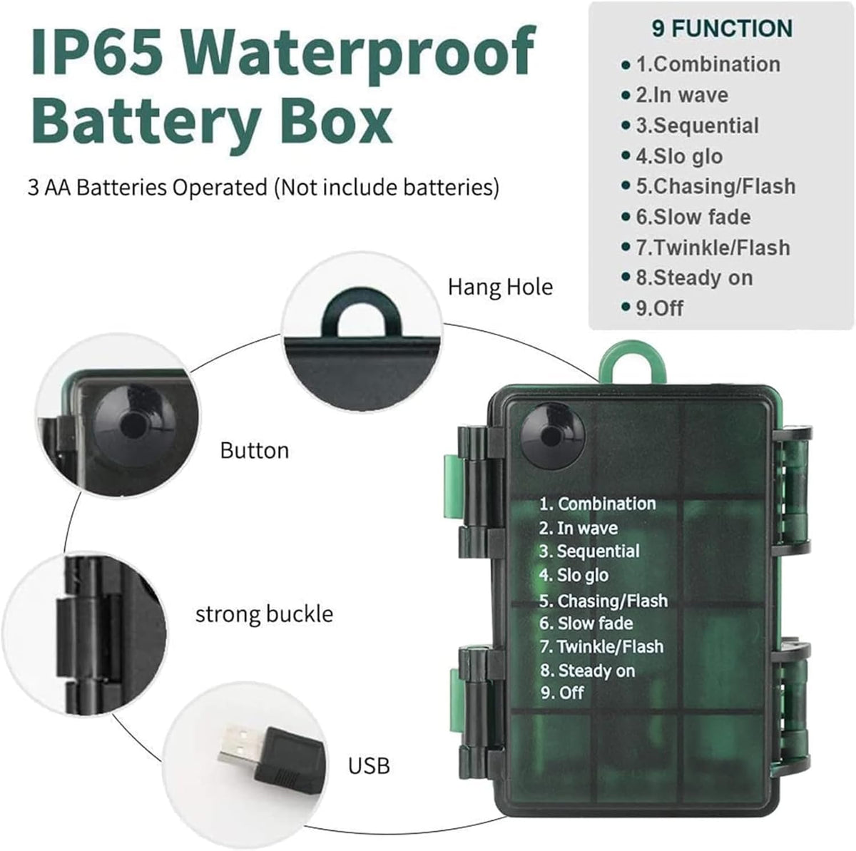 Q: What lighting modes are available with these Christmas lights?A: These Christmas lights offer 8 different lighting modes, including Combination, In wave, Sequential, Slo glo, Chasing/Flash, Slow fade, Twinkle/Flash, and Steady on, allowing you to customize your display.