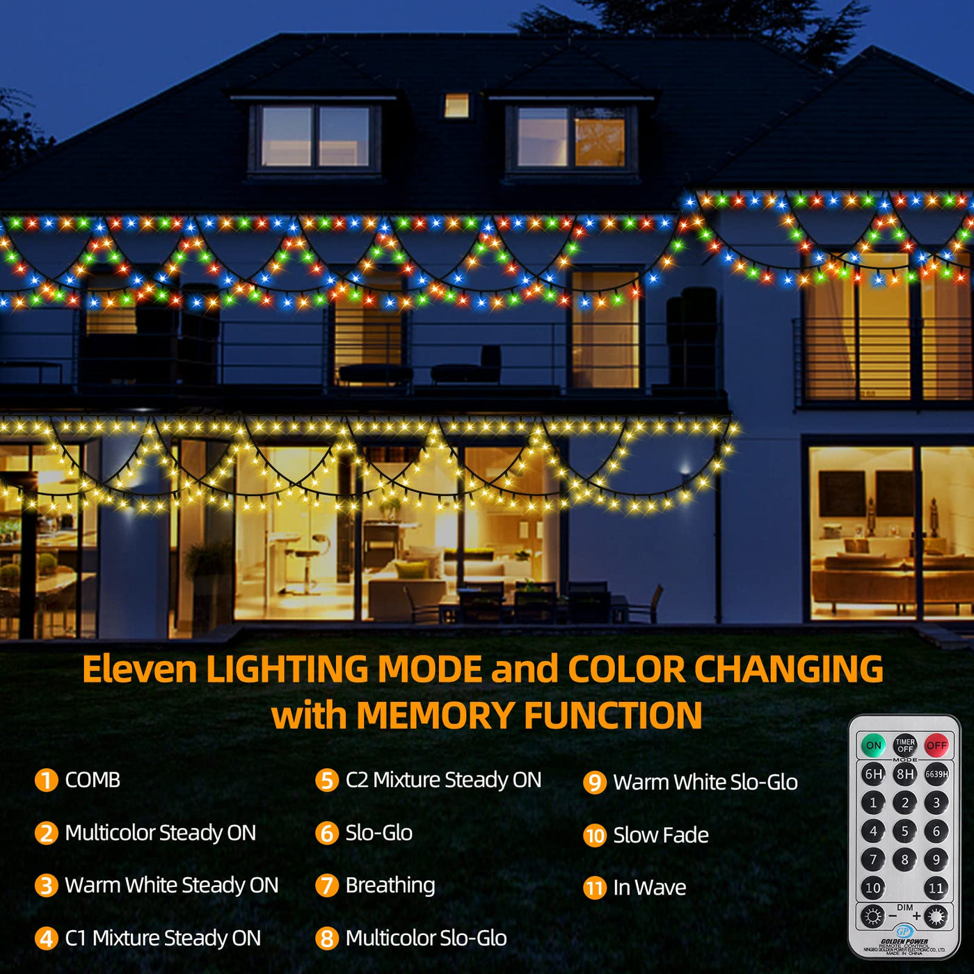 Q: How many lighting modes do the string lights have?A: The string lights offer eleven different lighting modes, including various combinations of warm white and multicolor settings.