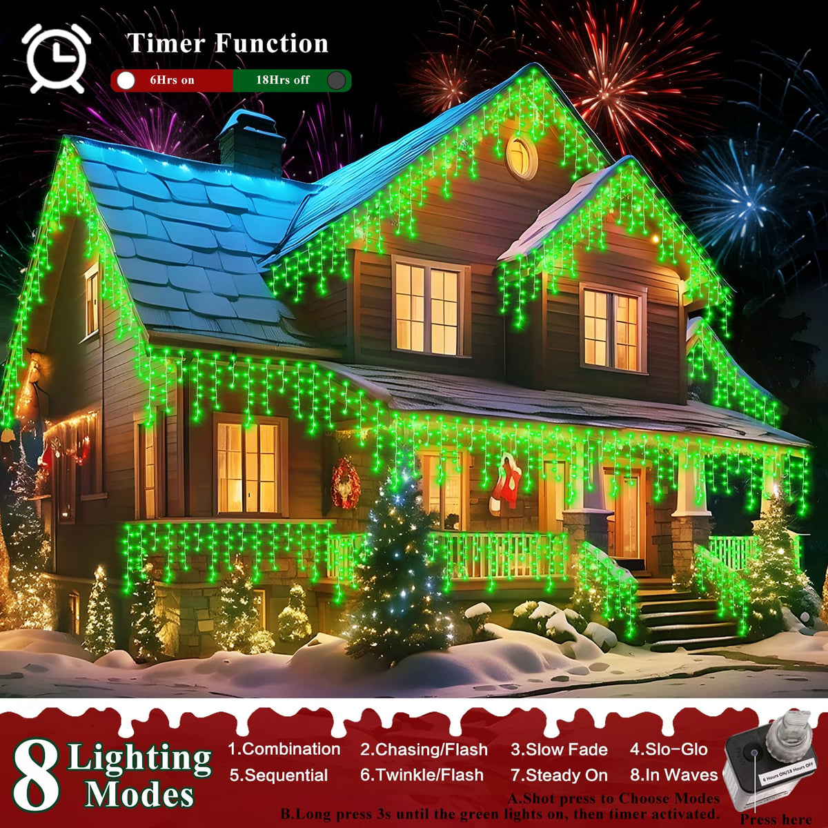 Q: How does the timer function work on these lights?A: The built-in timer function allows the lights to operate for 6 hours on and 18 hours off. This feature helps save energy and ensures your decorations are lit during the desired hours.