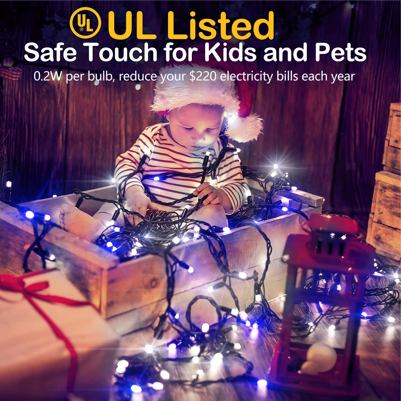 Q: Are the XURISEN Christmas Lights safe for children and pets?A: Yes, these lights are UL listed and powered by low voltage, making them safe for use around children and pets. They are designed to prevent electric shock and have low energy consumption.