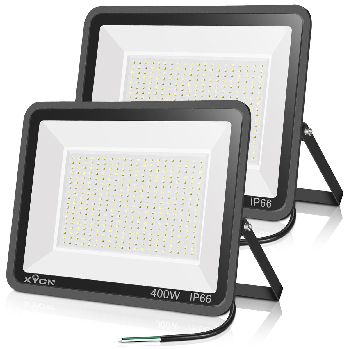Q: What are the main features of the XYCN 400W LED flood lights?A: The XYCN 400W LED flood lights feature 480 ultra-bright LEDs, providing up to 50000 lumens of brightness. They are energy-efficient, capable of replacing 2350W halogen bulbs, and have a long lifespan of over 50,000 hours. Additionally, they are made from durable aluminum with IP66 waterproof rating, making them suitable for both indoor and outdoor use.