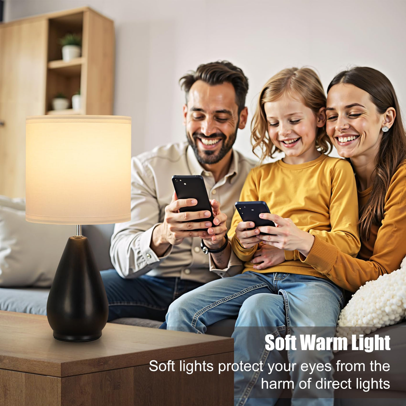 Product Description Yacoto 15.8 Small Table Lamps Set of 2 for Bedroom, Black Bedside Lamps for Nightstands Kids Room, Ceramic Lamp Base with 3 Color Temperatures, Modern Desk Lamp for Reading, for Living Room, Office, Dorm, side table.(2 Bulbs Included) Product Specifications Color: Black base, white shade Size: 15.8'' H x 7.5'' W Materials: ceramic+fabric+metal+PVC Feature: 3 Color temperatures Switch Type: Rocker switch Product Contain ceramic base *2 fabric shade*2 E26 bulb *2 ring for shade *4 instruction *1