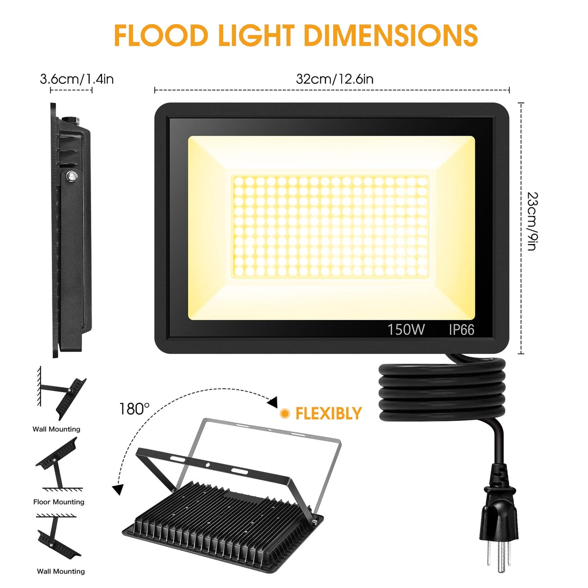 Yanycn Excellent Led Lights For Customers Led Flood Light 150W Led Flood Lights Before Leaving The Factory, Carry Out Four Waterproof Inspection Processes And 100% Inspection To Ensure Excellent Waterproof Effect And Reduce The Maintenance Cost Of Customers. Led Flood Lights Adopts High-Quality Lamp Beads, Strictly Controls The Procurement Quality, And The Light Attenuation Is Less Than 2% Per Year, Which Greatly Prolongs The Use Span Life Of Commercial Flood Lights. Bright And Comfortable Led Flood Lights Stadium Lights Led Commercial Led Flood Lights Independent Optical Grade Lens, Accurate Light Distribution, Effective Suppression Of Glare And Scattered Light. High Purity Aluminum Integrated Heat Dissipation, Fast Heat Conduction And Excellent Heat Dissipation Performance. The Safety And High Light Transmittance Tempered Glass With Unique Design Is Adopted Die Cast Aluminum, Scratch Resistant And Fade Resistant. Efficient Cooling Structure:Special Appearance Of Anti-Static And Anti-Corrosion. It'S Worth It. Specifications Wattage: 150W Led Type: 180Pcs Leds 3030 Efficiency: 140Lm/M Power Factor:0.95 Cri: ≫85Ra Input Voltage: Ac85-277V Ip Rating: Ip66 Lifetime(L70 Standard): ≫50,000 Hours Lumens: 15500Lm Color Temperature: 3000K Warm White Material: Aluminum +Pc Cable Length: 60 In Led Chip And Save Energy Features Durable Die-Casting Aluminum Structure With Excellent Heat Dissipation For High Conductivity And Stable Performance. Ip66 Waterproof For Wet Locations Or Bad Weather.&Nbsp; Resists Rust, Corrosion, Cracking.&Nbsp; Outstanding Corrosion Protection. Outstanding Thermal Solution Suit For Usage In Commercial Application And Provide Wide Angle Brightness Control. Save Energy And Money.&Nbsp; Energy-Efficient Led Technology Lowers Energy Usage.&Nbsp; Emits Over 15500Lm For Led Area Light. Instant-On.&Nbsp; 50,000Hrs Lifespan.&Nbsp; No Flicker.&Nbsp; Environment Protection Without Uv Or Ir Radiation. Widely Application.&Nbsp; Stadiums, Sport Courts, Parking Lots, Bridge, Building Exterior Wall, Squares, Billboards Rural Areas, Gardens, Dark Backyards, Warehouse, Street, Security Areas Specifications Of Led Court Light