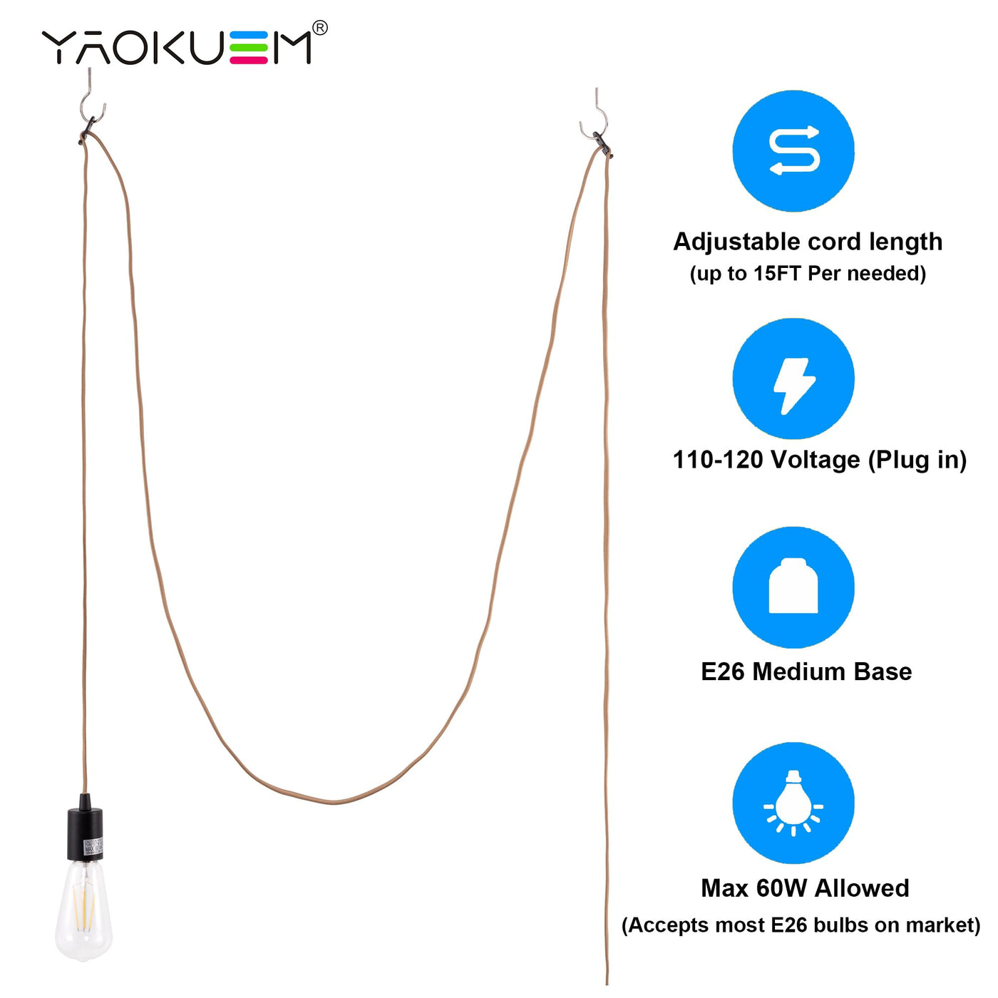 Q: How long is the cord for this hanging light kit?A: The YaoKuem Pendant Lighting comes with an adjustable 15 feet cord, allowing you to customize the hanging length to fit your space perfectly.