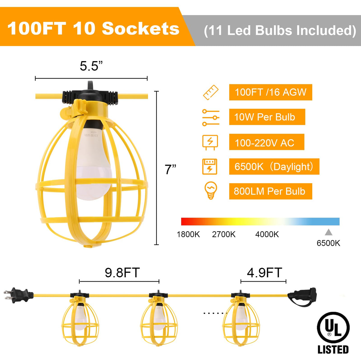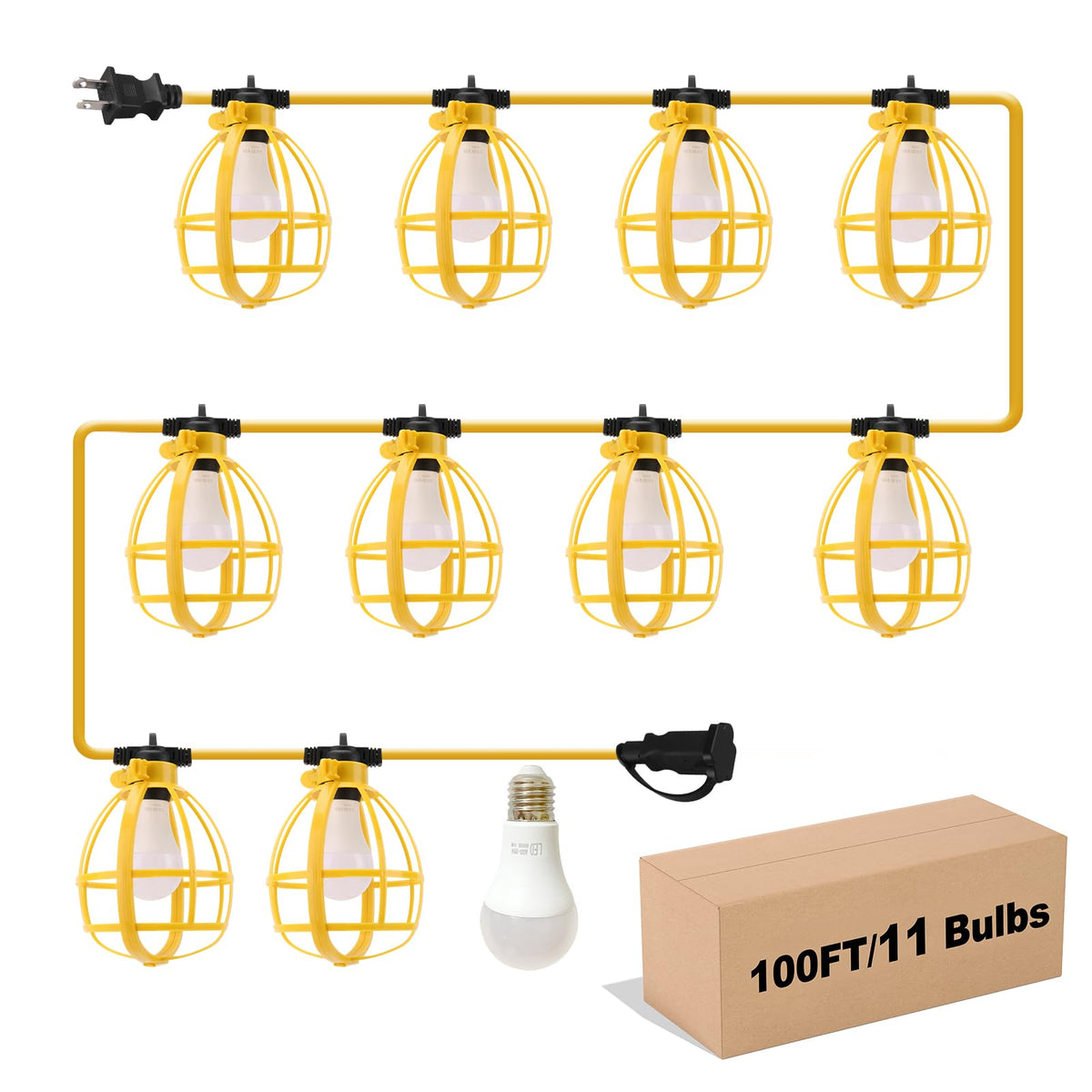 Yaoledly 100FT Construction String Lights - 100W, 11 Bulbs, IP65 Waterproof, 8000LM, 6500K for Indoor/Outdoor Job Sites, Yellow