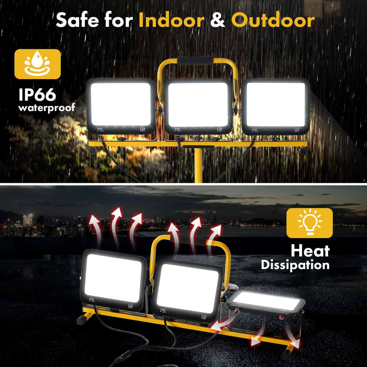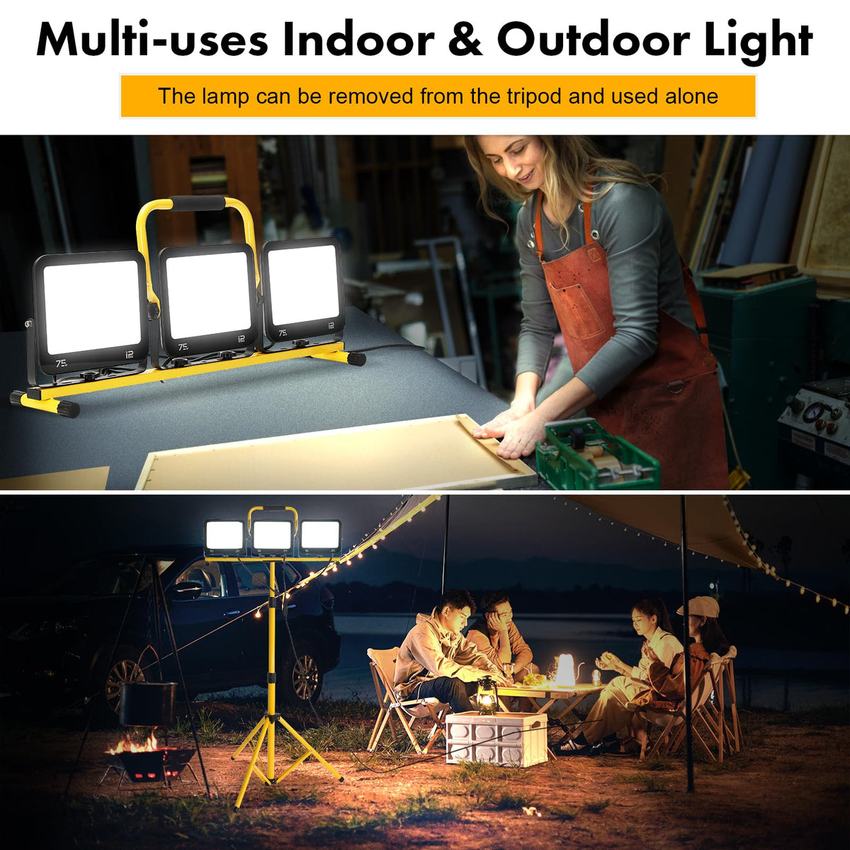 Yaoledly 225W 22500 Lumen Work Lights With Stand, Three Head Led Work Light With Individual Switch, 15Ft Power Cord, Ip66 Waterproof, Adjustable Metal Telescoping Tripod For Indoor And Outdoor