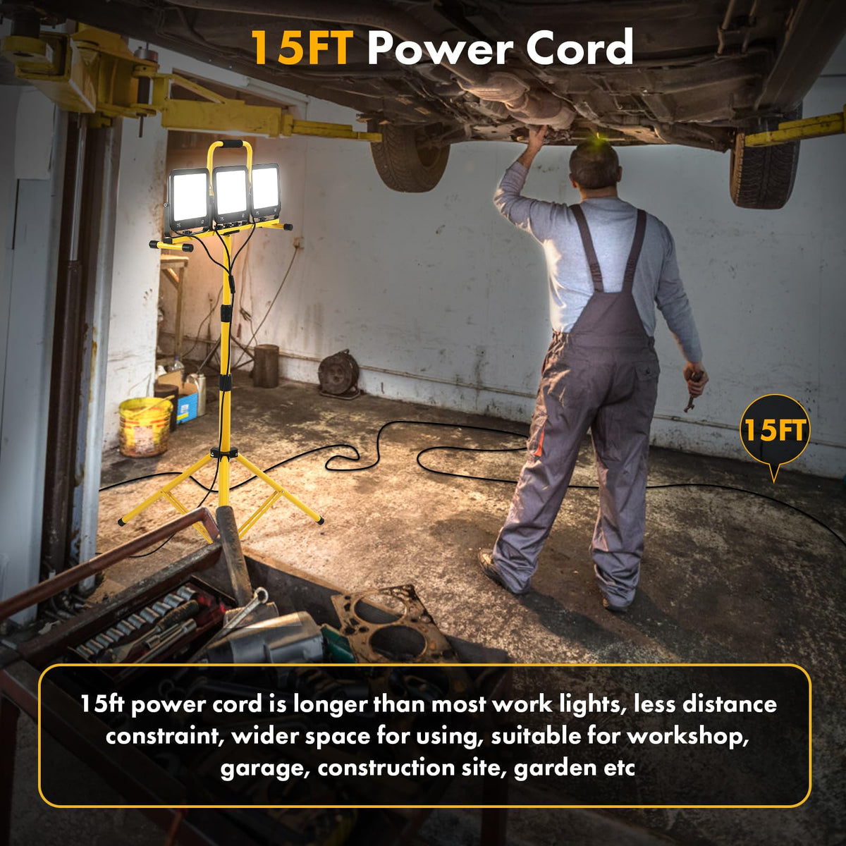 Q: What is the length of the power cord for the Yaoledly Work Light?A: The Yaoledly Work Light comes with a 15-foot long power cord, providing an extended range of use without creating unnecessary clutter, making it ideal for workshops, garages, and construction sites.