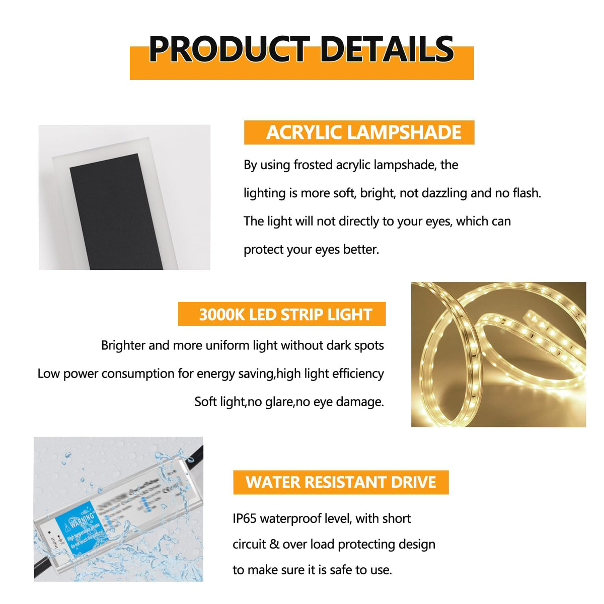 - **Versatile Applications**: With an IP65 waterproof rating, this patio wall light fixture is suitable for both indoor and outdoor use. Ideal for corridors, exhibition halls, terraces, porches, and doorways.