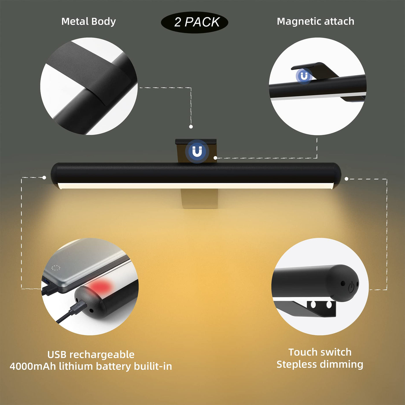 Q: What are the key features of the 2pack Picture Lights?A: The 2pack Picture Lights feature a rechargeable 5000mAh battery, three lighting colors (warm, natural, and white), adjustable brightness from 10% to 100%, and a timer setting for auto-off at 15, 30, 60, or 120 minutes. They can be operated via remote control or a touch button.