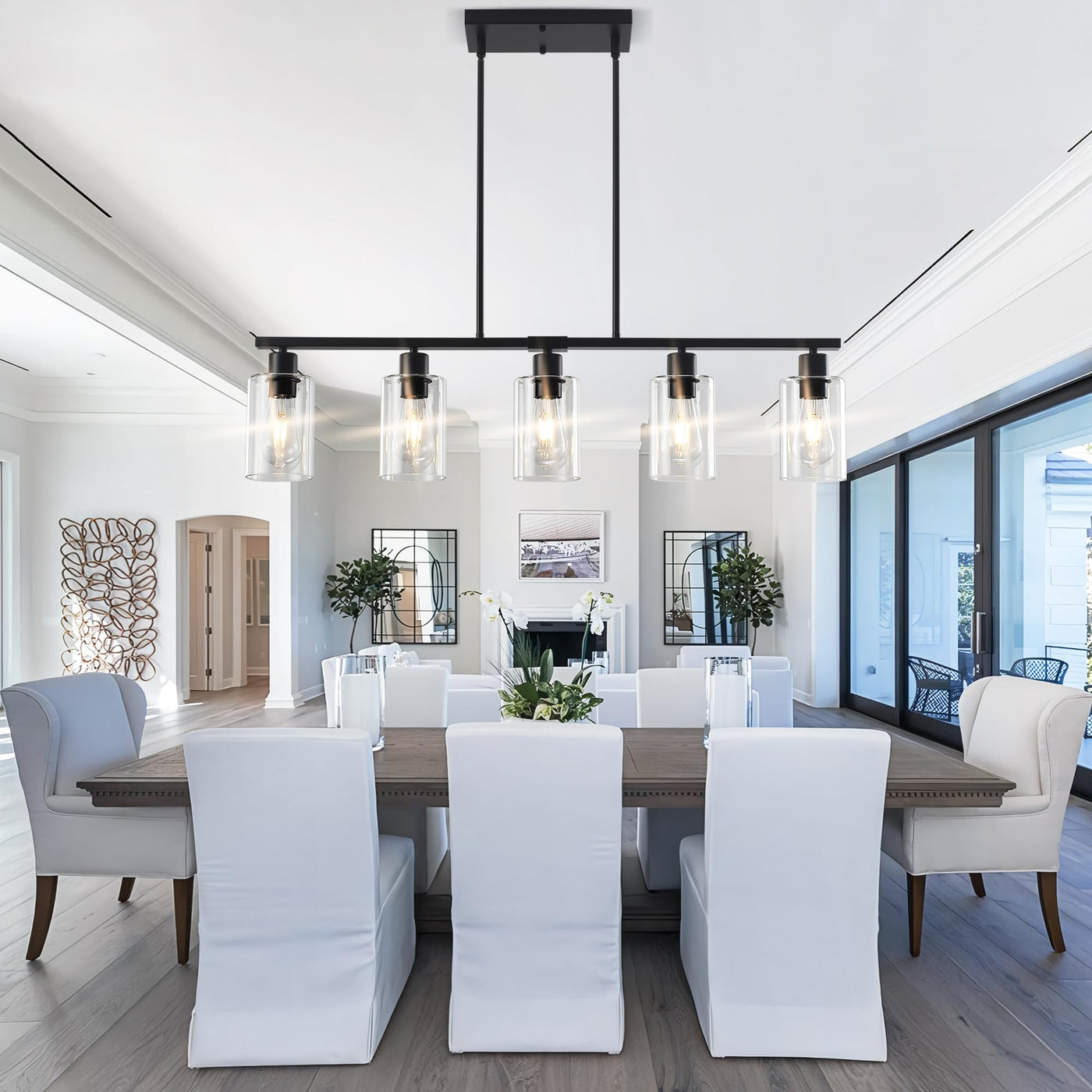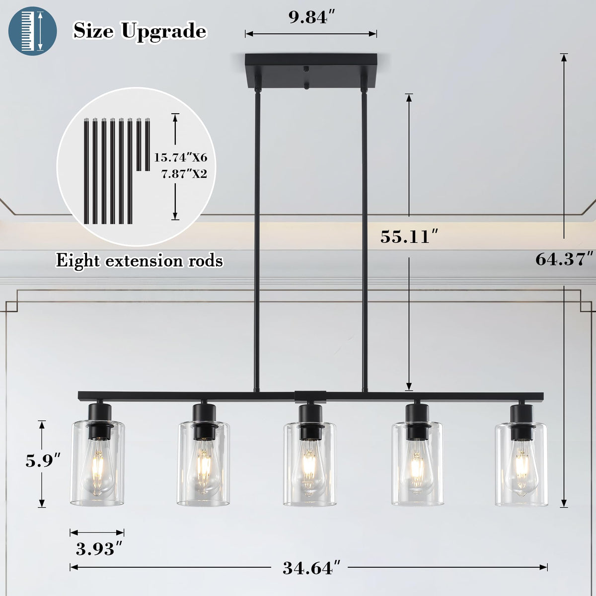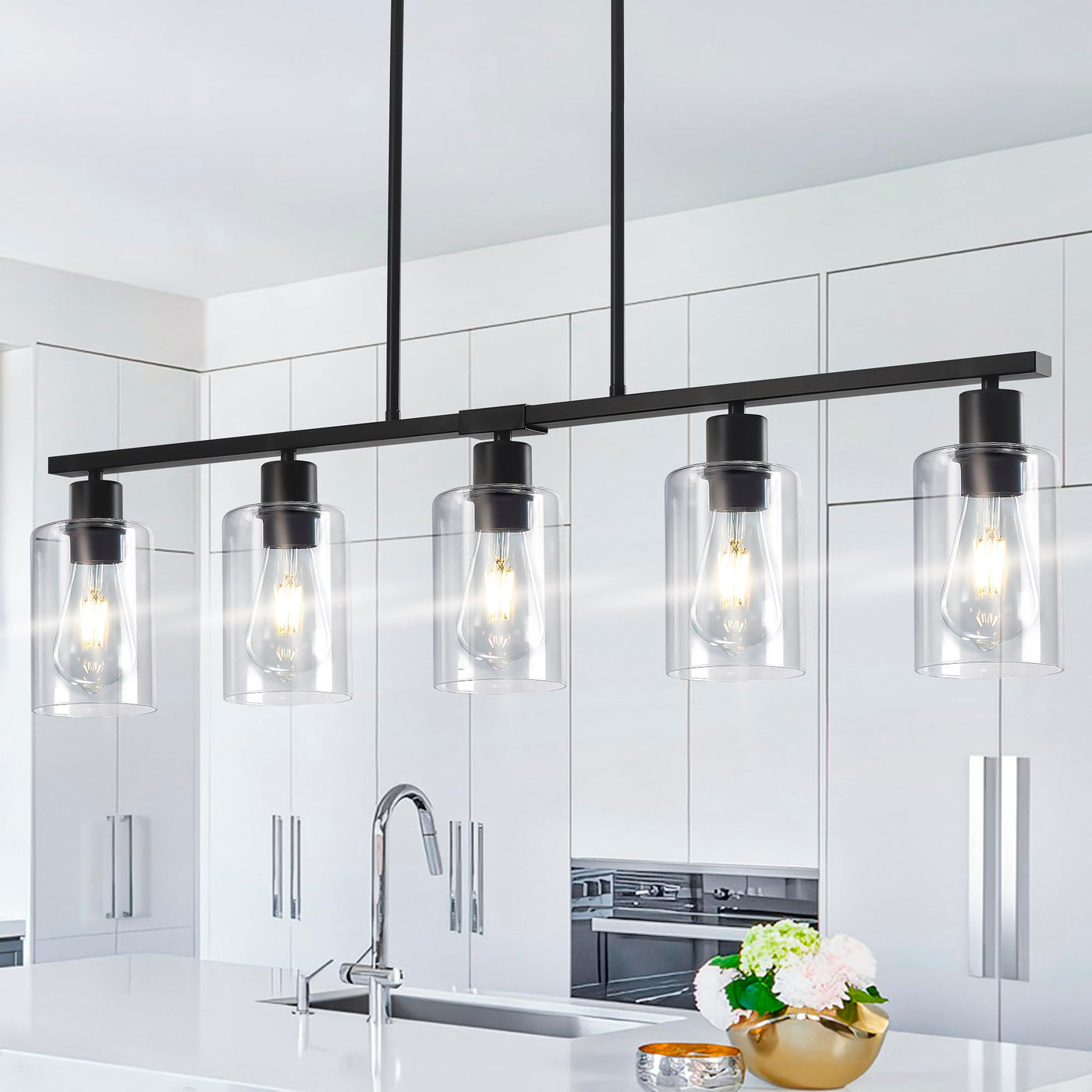 Yarlkav Black Linear Chandelier For Kitchen Island - 5 Light Pendant Lighting Fixture With Glass Shades, Adjustable Height Farmh