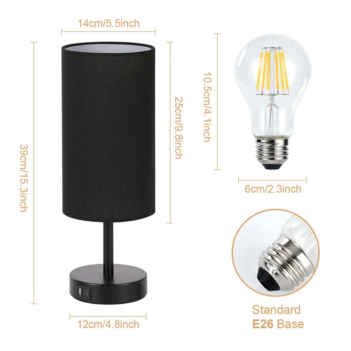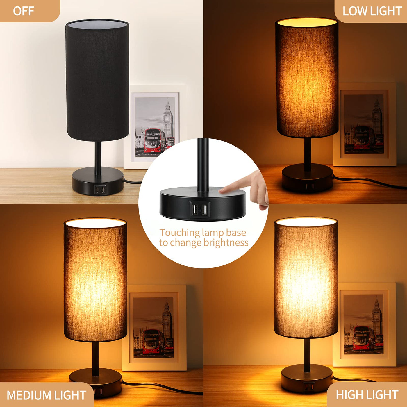 Yarra-decor Bedside USB Touch control Table LampLamp Type: Touch controlPerfect for: Study, bedroom, living room, student dormitory, office, childrens roomLamp Style: ModernFinish: MetalWhy choose Yarra-decor Table LampUsing the best quality components, each and every one of Table Lamp is very durable control the Switch by Easy TouchSimple and convenient enough to adjust the light switch by easy Touch when lying on your bed Solid Base and Non-slip MatAvoid the obvious scratches caused by the friction between the lamp and the desk Keep Your Table Neatcharge your mobile phone, tablet and other electronic devices freely by its dual charging portsSPEcIFIcATIONSBulb Type: Edison BulbSwitch type: Touch controlPower Supply: AcBrightness: 800Lm BrightnessWattage: 60W MaxUSB charging Port: 5V21APlug: Standard US Plugcolor temperature: 2700K Warm WhiteShade Material: LinenLife Span: 25000+ hoursPAcKAgE INcLUDES1*Table Lamp with US Plug1*E26 Base Warm White Led Bulb1*User ManualWARM TIPS-Please cut off the power supply before installation for your safety-Using the product on 110-120V voltage working environment-Before lighting the lamp, please insert the plug into socket