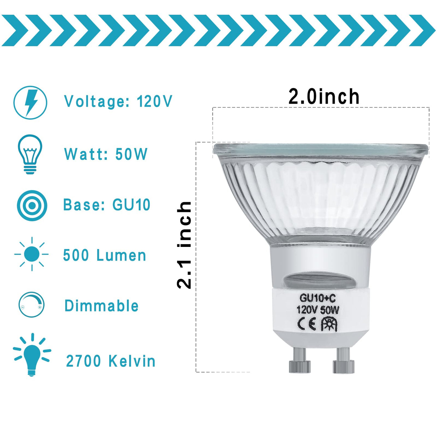 Specifications Input Volt: 120V Wattage: 50W Lumen: 500lm Color Temperature: 2700K(Warm White) Color Rendering: CRI>99 Lamp Base: GU10 Dimmable: Yes Lifespan: 2000+ hours