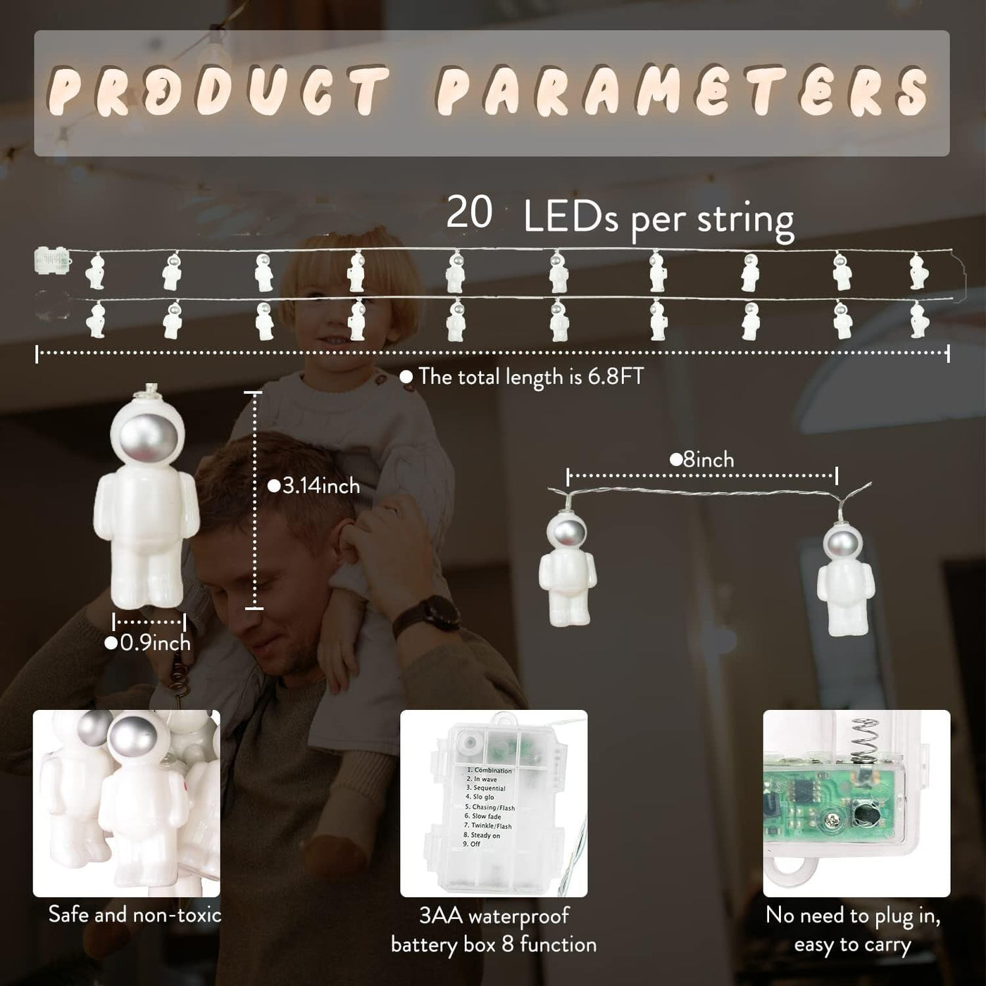 Q: What are the dimensions and length of the YEAMAR Astronaut Pendants String Lights?A: The YEAMAR Astronaut Pendants String Lights feature a total length of 14 feet, making them perfect for decorating various spaces, including nurseries, kids' rooms, and outdoor areas.