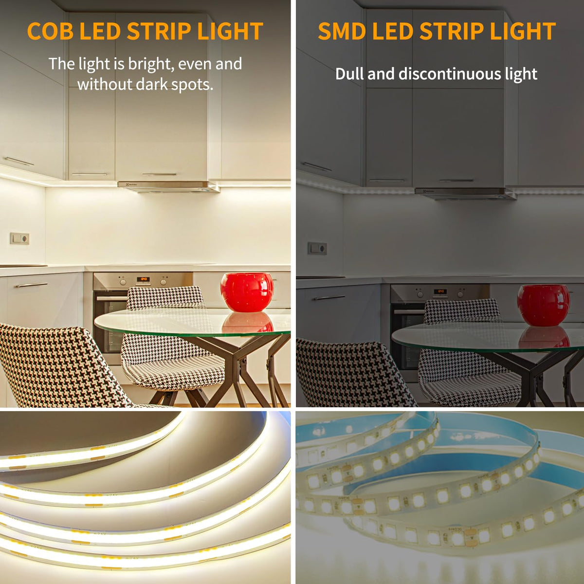 COB LED Strip Lights 3000K 50ft DC 24V Dimmable Warm White Flexible LED Tape Light for Bedroom, with remote and app control LED Tape Lights CRI90+,for DIY Home Decoration