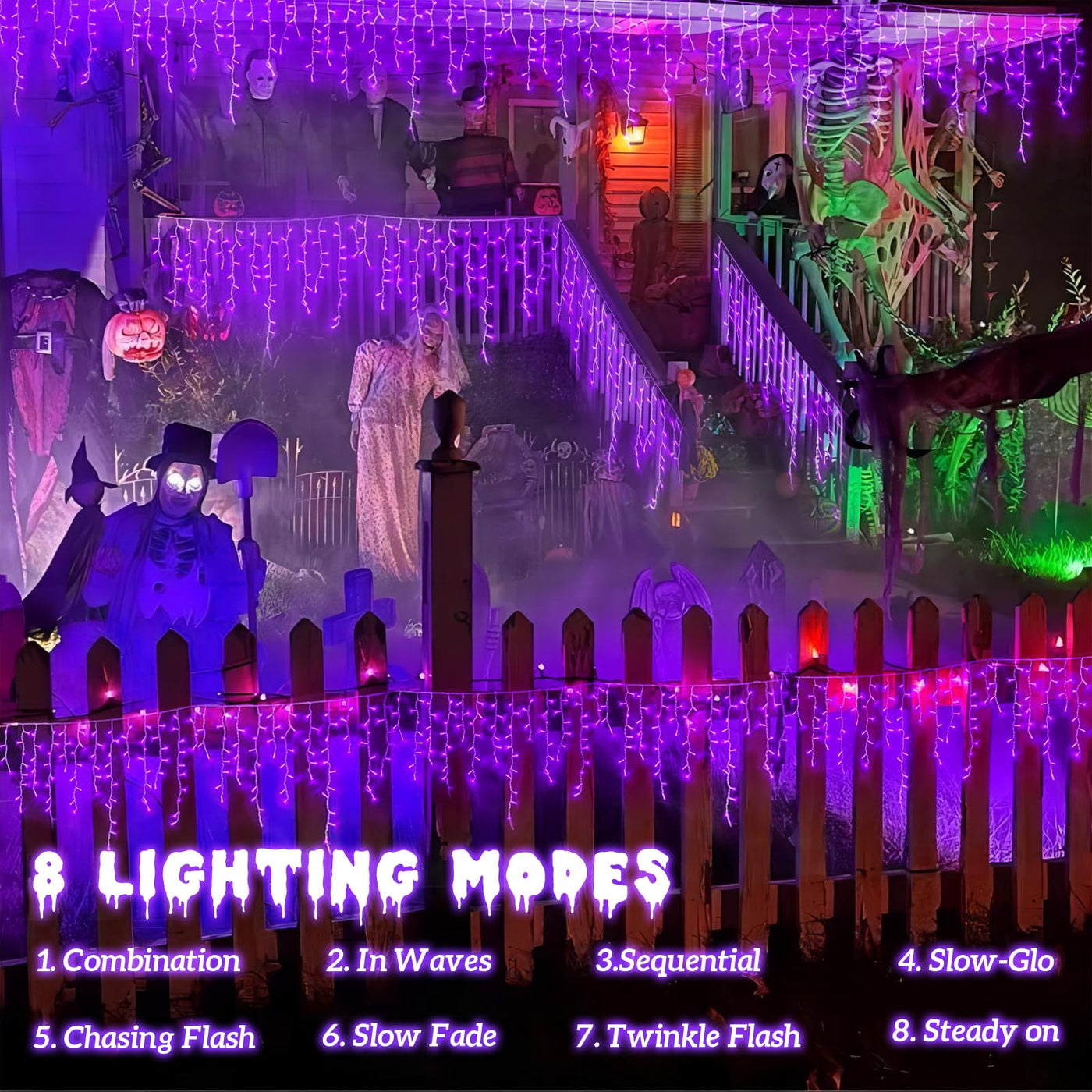 Q: What lighting modes do these icicle lights offer?A: The YEGUO Icicle Christmas Lights come with eight lighting modes including combination, in wave, sequential, slo-glo, chase/flash, slow fade, twinkle/flash, and steady on, which can be adjusted using the adapter button.