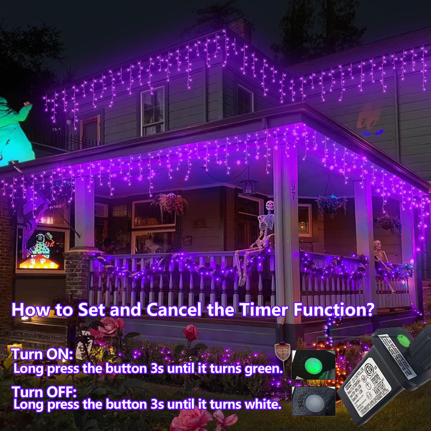 Q: How do I set the timer function on these lights?A: To set the timer function, simply press and hold the button for three seconds until it turns green. The lights will then automatically turn on for six hours and off for eighteen hours.