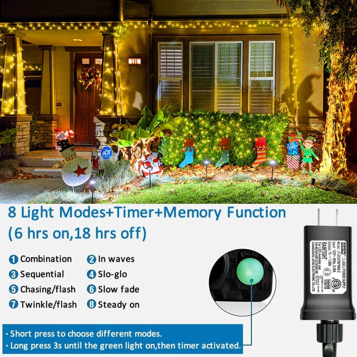 Q: How do the memory and timer functions work on these lights?A: The built-in memory chip retains your last selected mode, eliminating the need to reset it daily. The timer function allows you to set the lights to stay ON for 6 hours and OFF for 18 hours, which can be activated by long-pressing the button until it turns green.