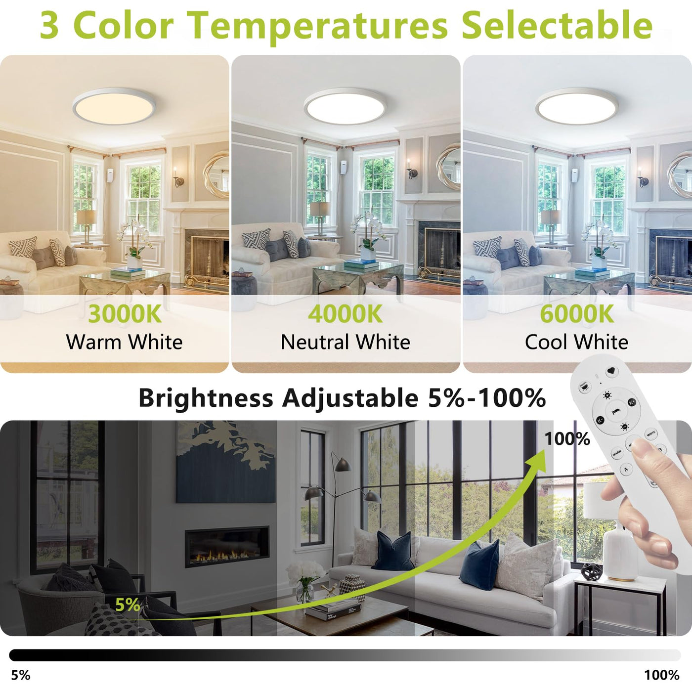 This flush mount ceiling light is equipped with advanced LED technology, delivering an impressive 4200 lumens of light output while consuming only 42 watts of energy. The included remote control allows for seamless dimming from 5% to 100% and enables you to adjust the color temperature between 2700K (warm light) and 6500K (daylight) to suit any mood or activity.
