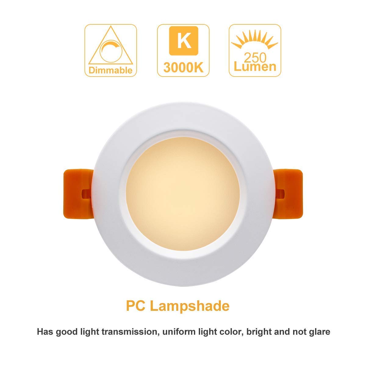 Better Lighting Colors: Cri80+, Provides Near-Sunlight Quality Light For True Color Rendering And Consistency Inside Your Home, Show Natural Color More Vibrantly. Save Your Electricity Cost: High Lumens Per Watt, Almost No Power Waste On Heat Output, Much Brighter And More Energy-Saving Than Traditional Bulbs. Wide Applications: Aluminum Housing, Excellent Corrosion Resistance And Heat Dissipation. The Light Would Meet Various Needs In Applications Such As Stores, Shopping Malls, Hotels, Restaurants, Cafe, Bars, Closets, Kitchens, Hallways, Basement, Etc. Specification: Power: 3W Input Voltage: 110V-130V Ac Emitting Color: 3000K Warm White Light Source: Led Dimmable: Dimmablebrightness: 250Lmcri: 80+ Material Type: Aluminum + Flame Retardant Pc Front Diameter: 70Mm/2.75Inch Cutout Opening Diamerter: 53Mm/2.08 Inch Height: 42Mm/1.65 Inch Package Includes: 1 X 3W Dimmable Led Ceiling Lights