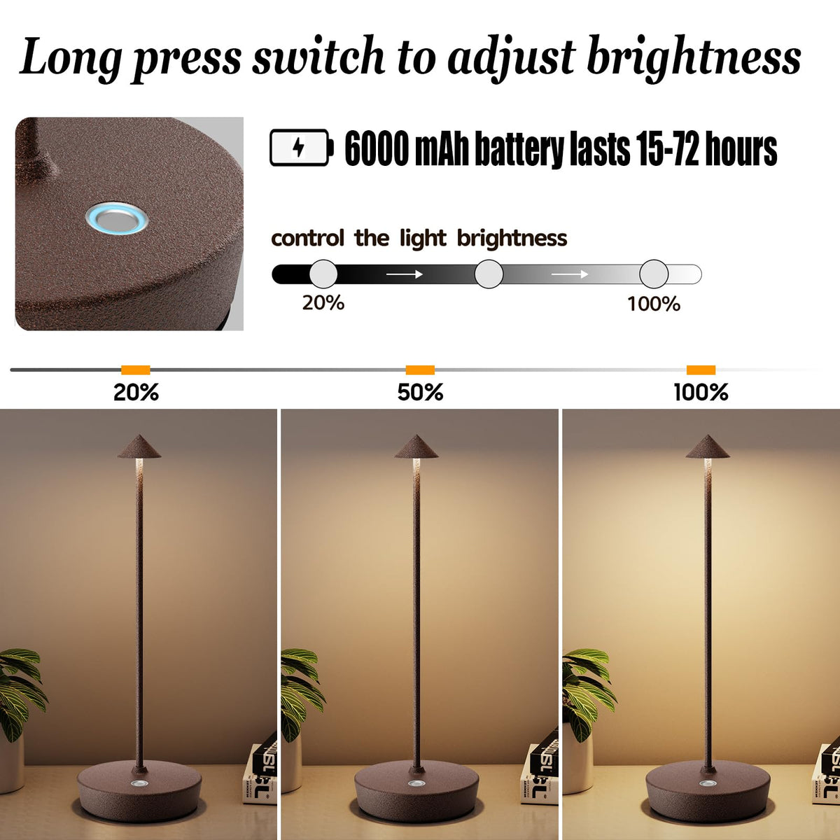 Q: How long does the battery last on the YIBEN Cordless Table Lamp?A: Depending on the brightness level, the 6000mAh battery of the YIBEN Cordless Table Lamp can last anywhere from 15 to 72 hours on a single charge, ensuring long-lasting use without frequent recharging.