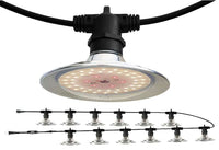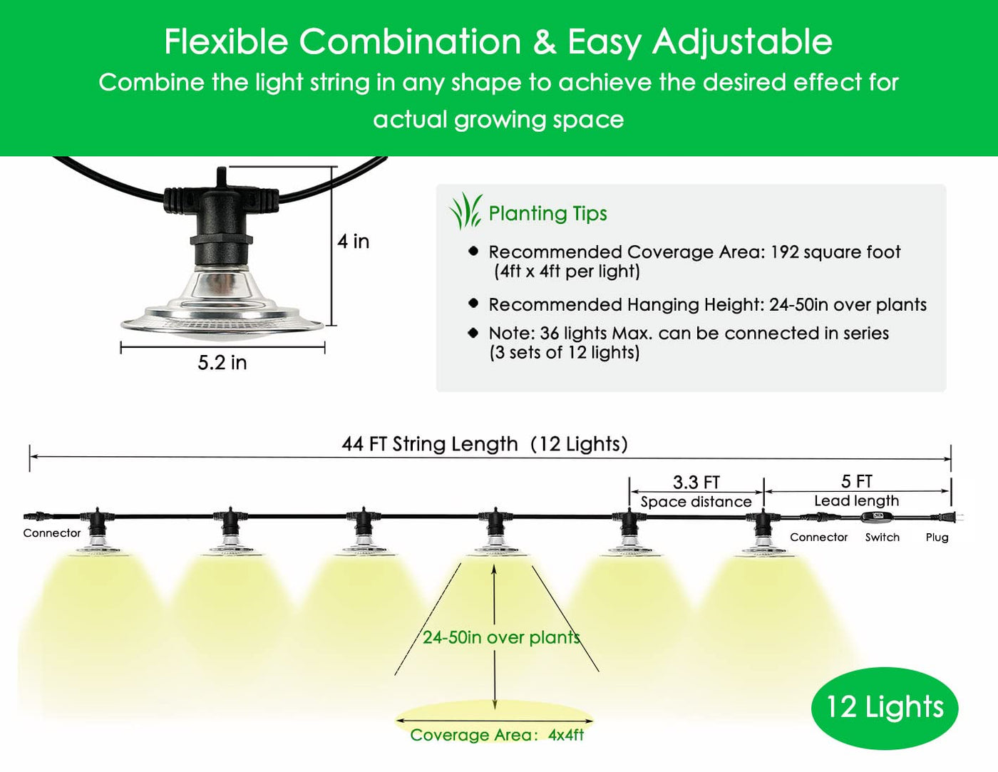 Specifications: - Size: 44 FT (12 Lamps), a set of 12 bulbs - Input Voltage: 100-277V - Power draw: 180W@120V, equivalent to 800W HPS - LED Qty.: 48 LEDs per lamp, 576 LED per string (12 lamps) - PPF: 420 micromoles per string(12 lights) - Max. recommended coverage: 364 sq. ft - Smallest recommended coverage: 16 sq. ft - Full spectrum: 3500K white led + 660 deep red led - Lamp socket: E26 - Operation environment: Outdoor/ Indoor (Waterproof) - Installation Height: 12in to 48in over plants