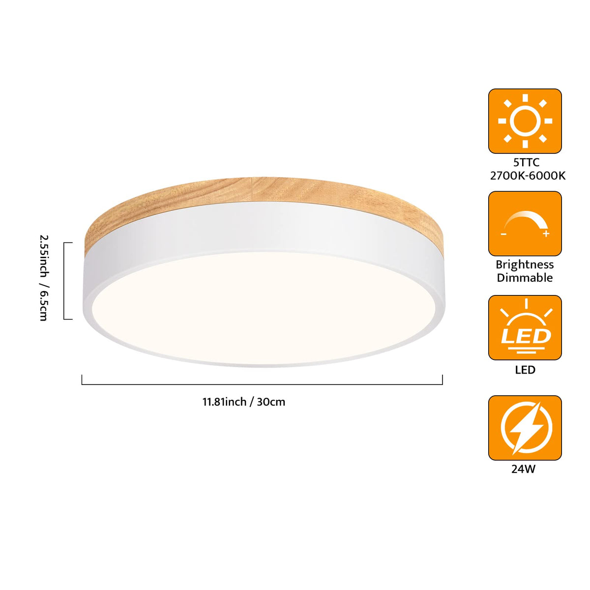 This ceiling light features a combination of well-made materials, including metal, wood, and acrylic, ensuring both durability and aesthetic appeal. The lamp body is finished in white, providing a clean, modern look that complements any decor. With a diameter of 11.8 inches (30 cm) and a height of 2.55 inches (6.5 cm), it is compact yet impactful, making it perfect for bedrooms, hallways, bathrooms, dining rooms, kitchens, and living rooms.