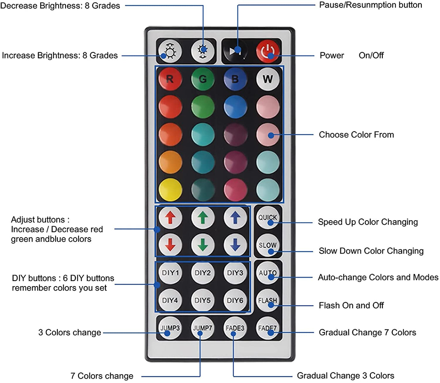 Transform any room into a vibrant and dynamic environment with the Yiliaw 44-Key IR RGB Remote Controller designed specifically for 5050, 2835, and 3528 LED RGB light strips. This innovative remote controller allows you to effortlessly control your lighting setup, offering a multitude of color options and effects to suit your mood or occasion.