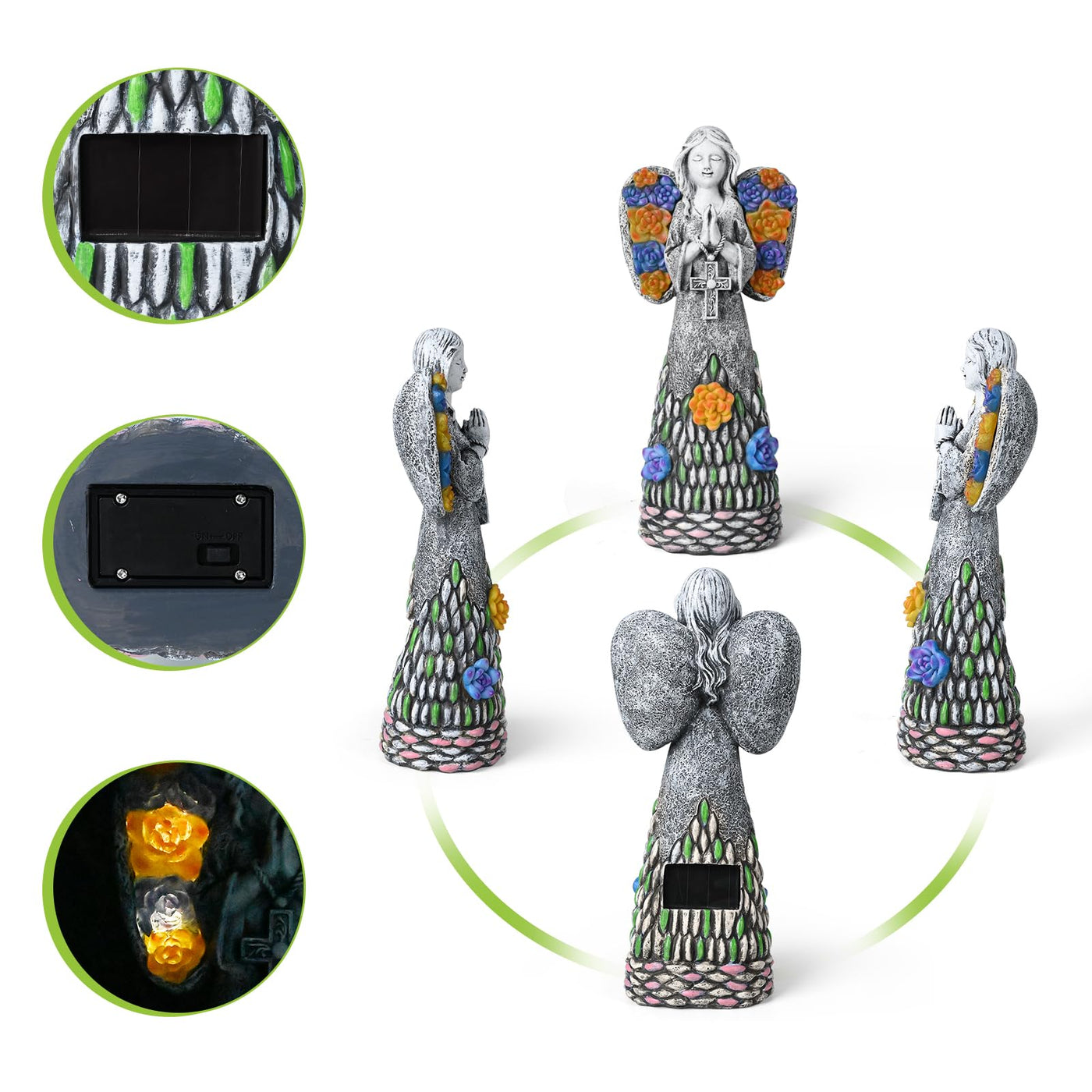 Q: How does the solar panel work on the angel statue?A: The solar panel on the Yiosax Garden Angel Statue charges during the day when the switch is turned on. It absorbs sunlight for about 8 hours and automatically lights up for 6-8 hours at night.