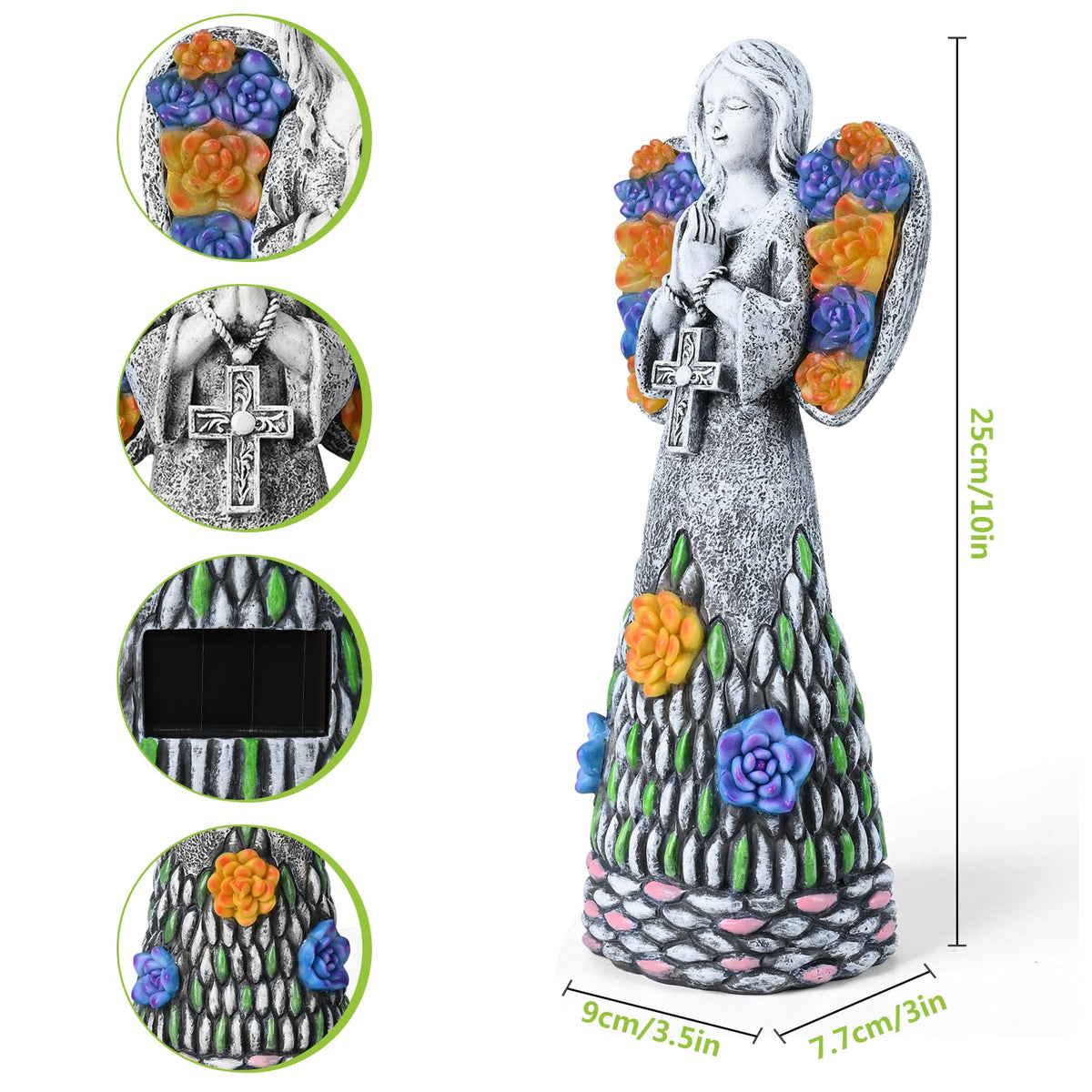 Q: What are the dimensions of the Yiosax Garden Angel Statue?A: The dimensions of the Yiosax Garden Angel Statue are approximately 4.5 inches in length, 3.3 inches in width, and 10.24 inches in height, making it a perfect size for garden or yard decoration.
