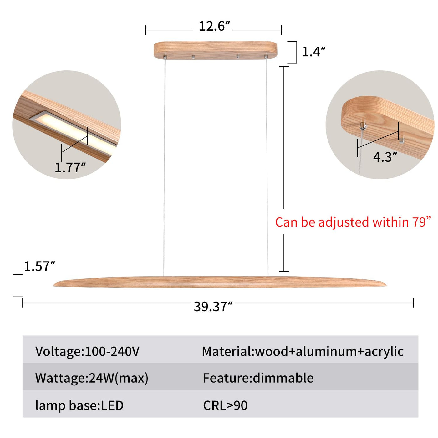 Q: What are the dimensions of the YISDESIGN 39" Wood LED Linear Pendant Light?A: The wooden parts measure 51 x 2.36 x 1.77 inches (L x W x H), and the mounting part measures 17.3 x 4.3 x 1.4 inches (L x W x H). The maximum height of the chandelier can be adjusted up to 78 inches.
