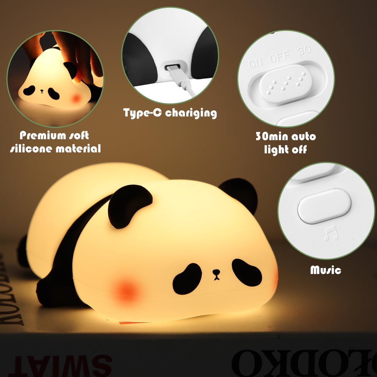 YISUN Panda Night Light with White Noise, Silicone Nursery Lamp for Baby and Toddler, Animal Night Light for Boys and Girls, Squishy Night Light for Kids Room Features:It is not just a light; its a whole vibe. Emitting a soft glow thats as relaxed as a Sunday snooze.Its squishy, its squeezablePerfect for setting the mood for bedtime stories, creating a chill-out zoneMade of squishy silicone30 Minute snooze modeThree levels of brightness. Simply tap to adjust.Battery PoweredUSB C cable includedA charge of just 2-3 hours provides up to 6 hours of light.Specification:Product material: ABS+SiliconeRated current: 1AInput voltage: 5VRated power: 2WInput interface: Type-CCharging current: 500mACharging time: 3HUsage time: 6HBattery capacity: 500mAh lithium batteryCharging reminder: Red light is on when charging, green light is on when fully chargedLow battery warning: The light brightness is low and the light goes out directlyBrightness adjustment: 3 LevelsSleep Timer: 30 MinutesProduct size: 4.53*5.47*4.1 inchPackaging size: 4.57*5.24*4.25 inchNote:CHOKING HAZARD -- Small parts. Not for children under 3 yrs.Due to manual measurements, please allow slight measurement deviations.Due to the different display and lighting effects, the actual color of the item may be slightly different from the color displayed in the picture.Package Included:1*Night Light1*Type-C cable