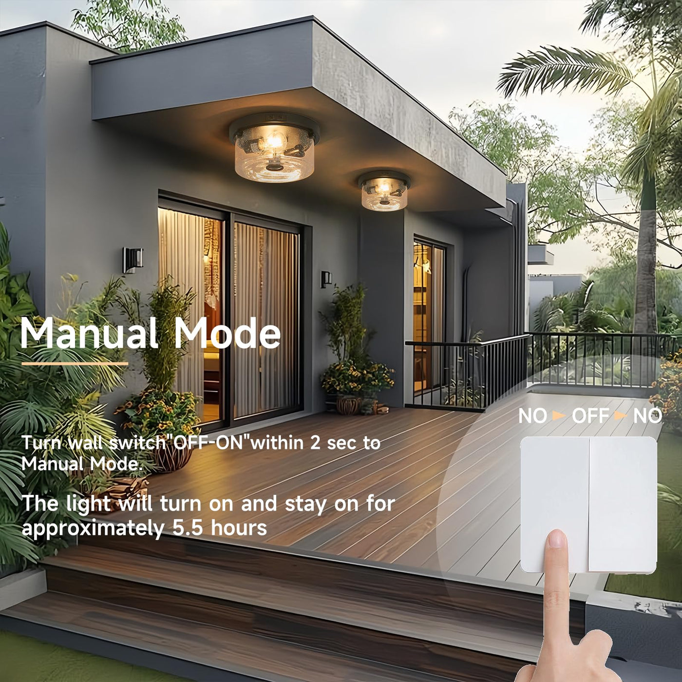 Q: What are the different lighting modes available with the Yisuro Motion Sensor Outdoor Ceiling Light?A: The Yisuro Motion Sensor Outdoor Ceiling Light features three distinct lighting modes: Test Mode, which turns on when motion is detected for about 5 seconds; Auto Mode, which activates at night and remains on as long as motion is detected for a preset duration of 5 seconds to 3 minutes; and Manual Mode, which allows the light to stay on for 5.5 hours when the wall switch is toggled off and on within 3 seconds.