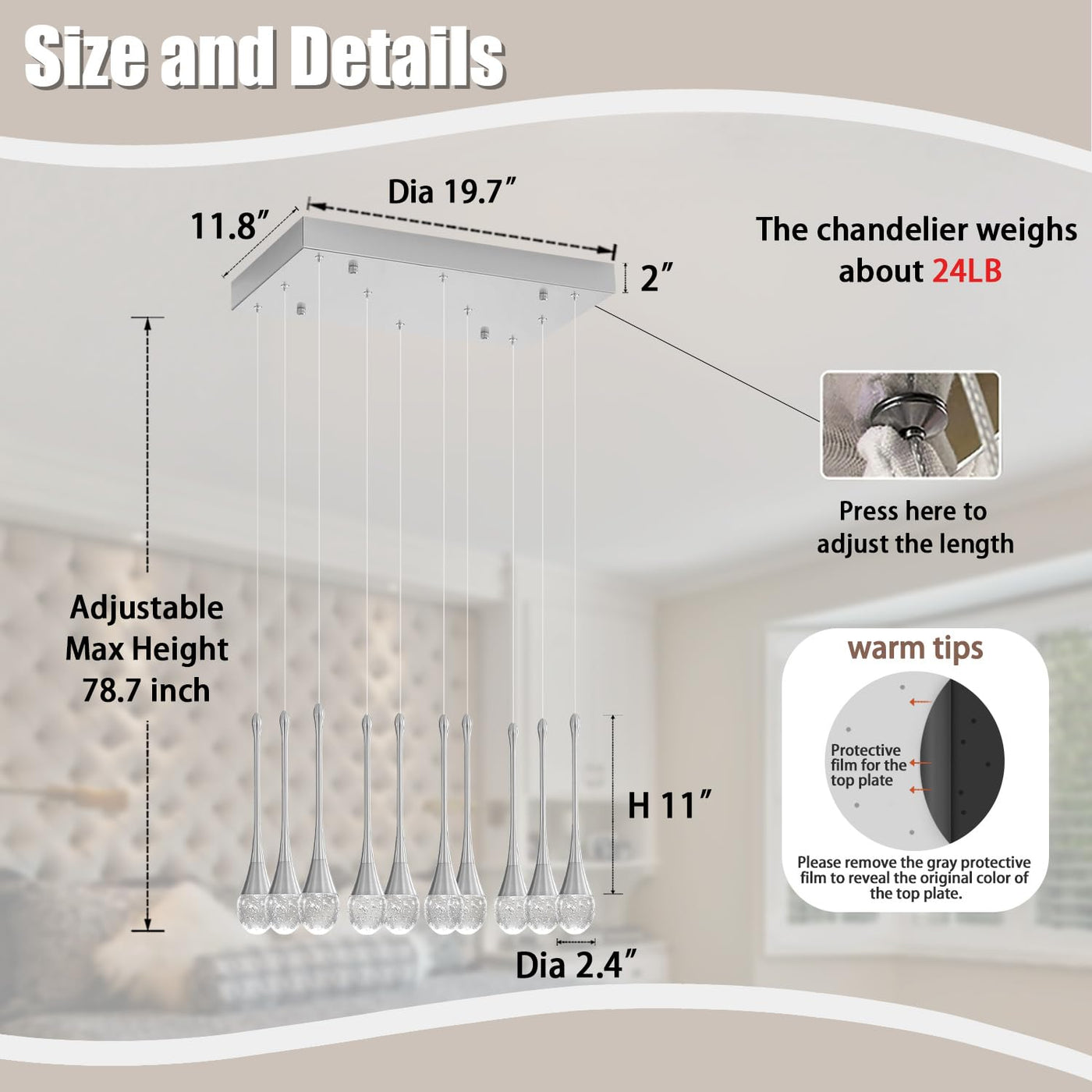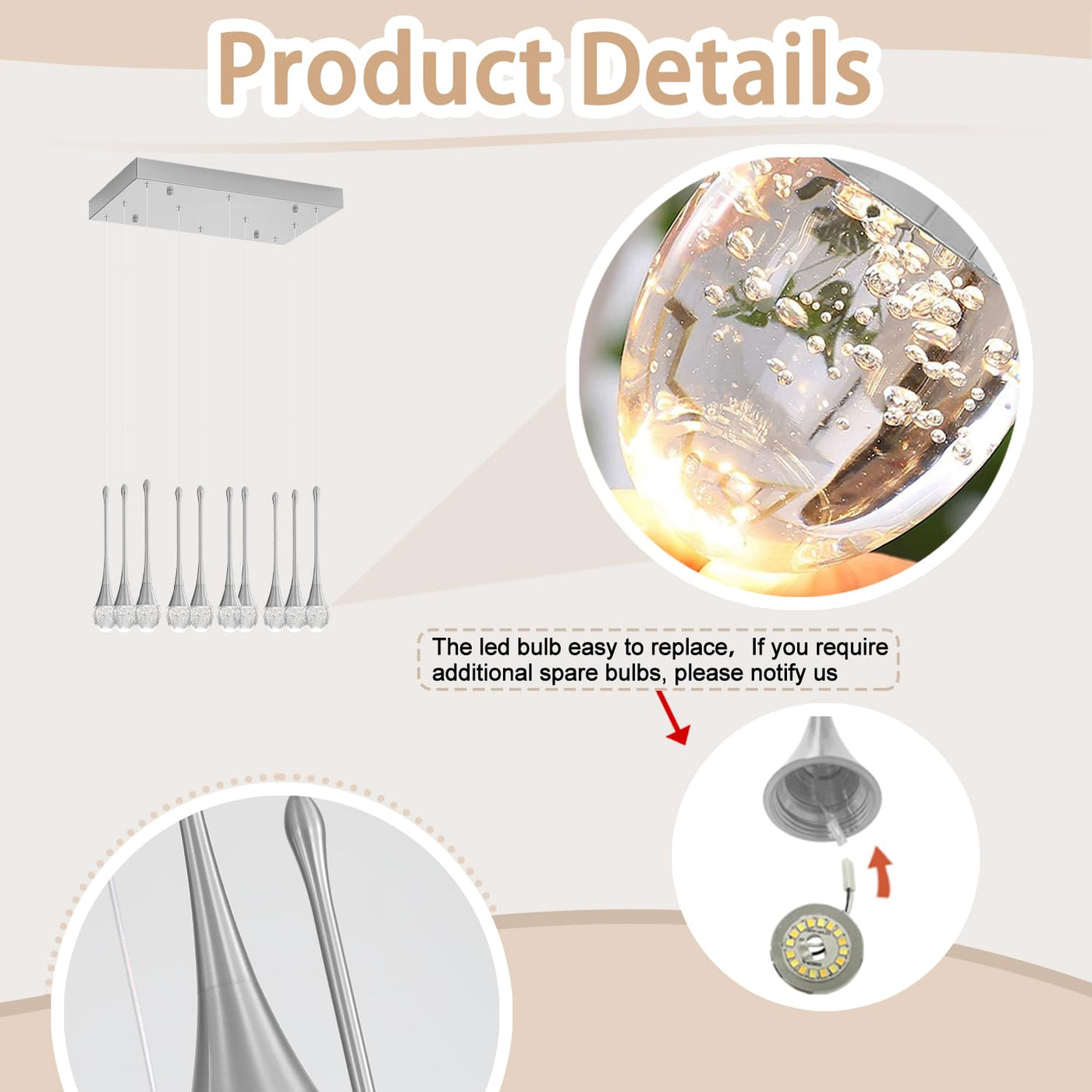 Ykolupty Rectangular Chandeliers For Living Room Silver Dining Room Lights Fixture Raindrop Pendant Lights Kitchen Island Crysta
