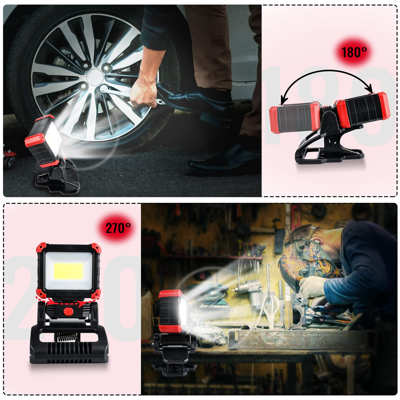 Yls 2Pack Led Work Light, 2100Lm Rechargeable Cob Magnetic Clip On Work Light With 3 Light Modes, 270° & 180° Rotatable Portable Clamp Worklight For Job Site,Car Repairing,Workshop