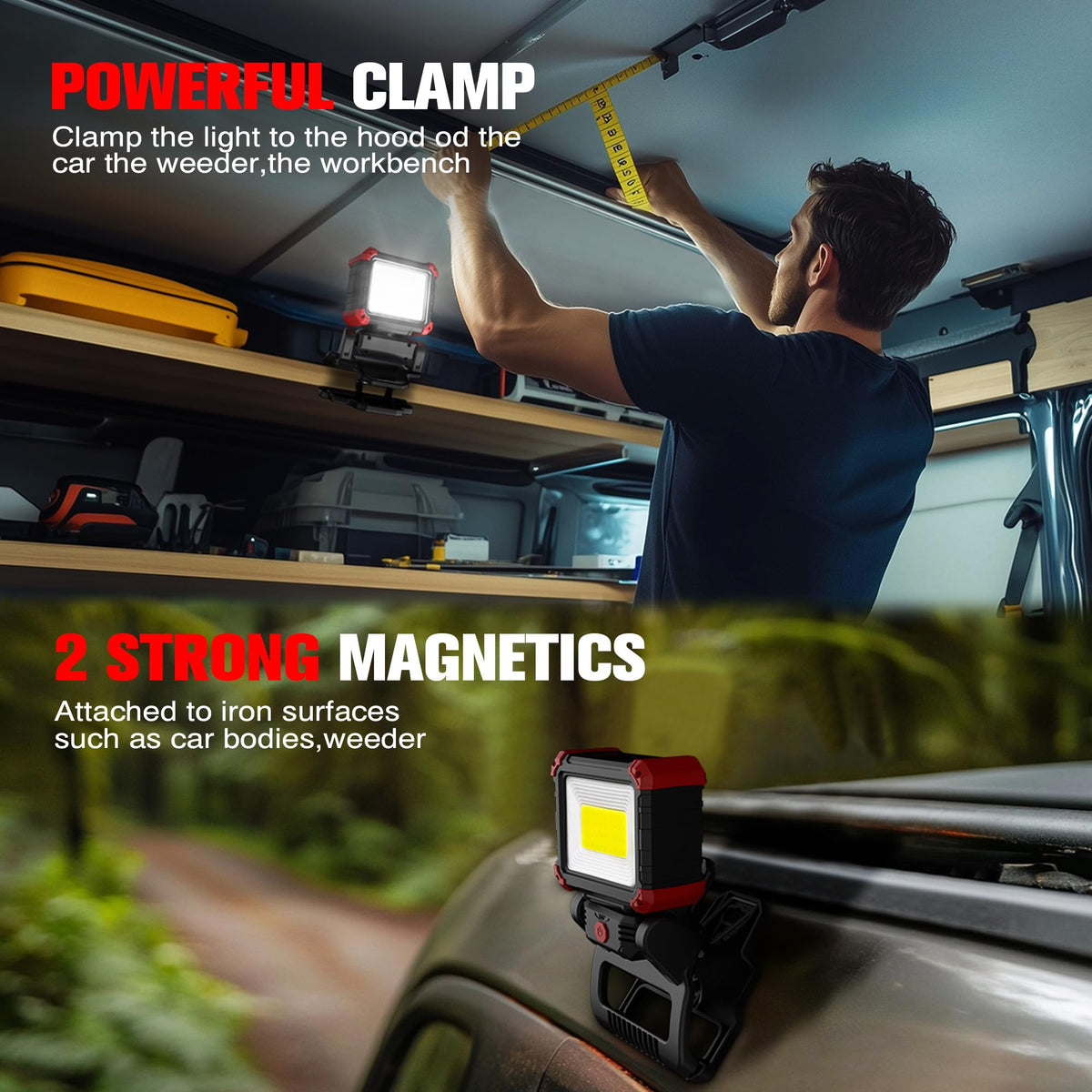 This work light packs a punch with its 2100 lumens, providing excellent illumination for nighttime work. With 3 modes - COB high, COB low, and COB strobe - you can tailor the light to your needs. The COB strobe mode allows for added safety as others can easily spot you. The light is USB rechargeable and can even charge your smartphone in case of an emergency. The handle and clip allow for easy portability and hands-free use, with a magnetic base that can attach to magnetic surfaces. The high-quality ABS engineering plastic shell of the light is water and impact-resistant, and the power indicator shows the remaining power and when to recharge.