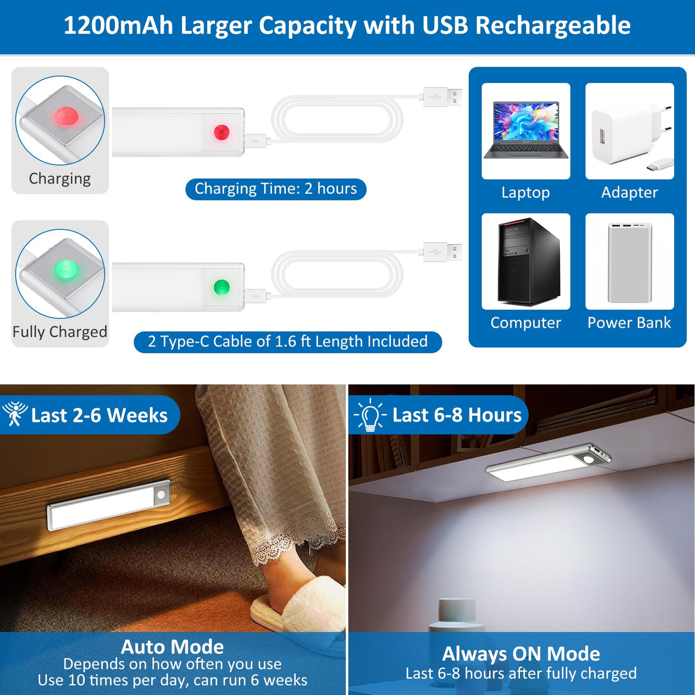 Q: What is the charging time and battery life of the rechargeable under cabinet lights?A: The built-in 1200 mAh rechargeable battery can be fully charged in just 2 hours via the USB-C port. Once fully charged, the lights can last up to 6 hours in ON mode and up to 6 weeks in AUTO mode when used approximately 10 times a day.